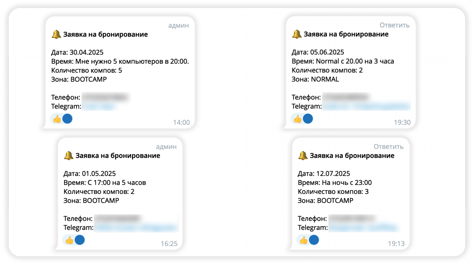 Бот запрашивает у пользователя основные данные: желаемое время посещения, количество компьютеров, контакты и передает заявку администраторам, которые связываются с человеком и подтверждают бронь.