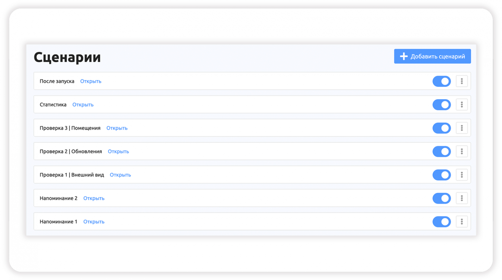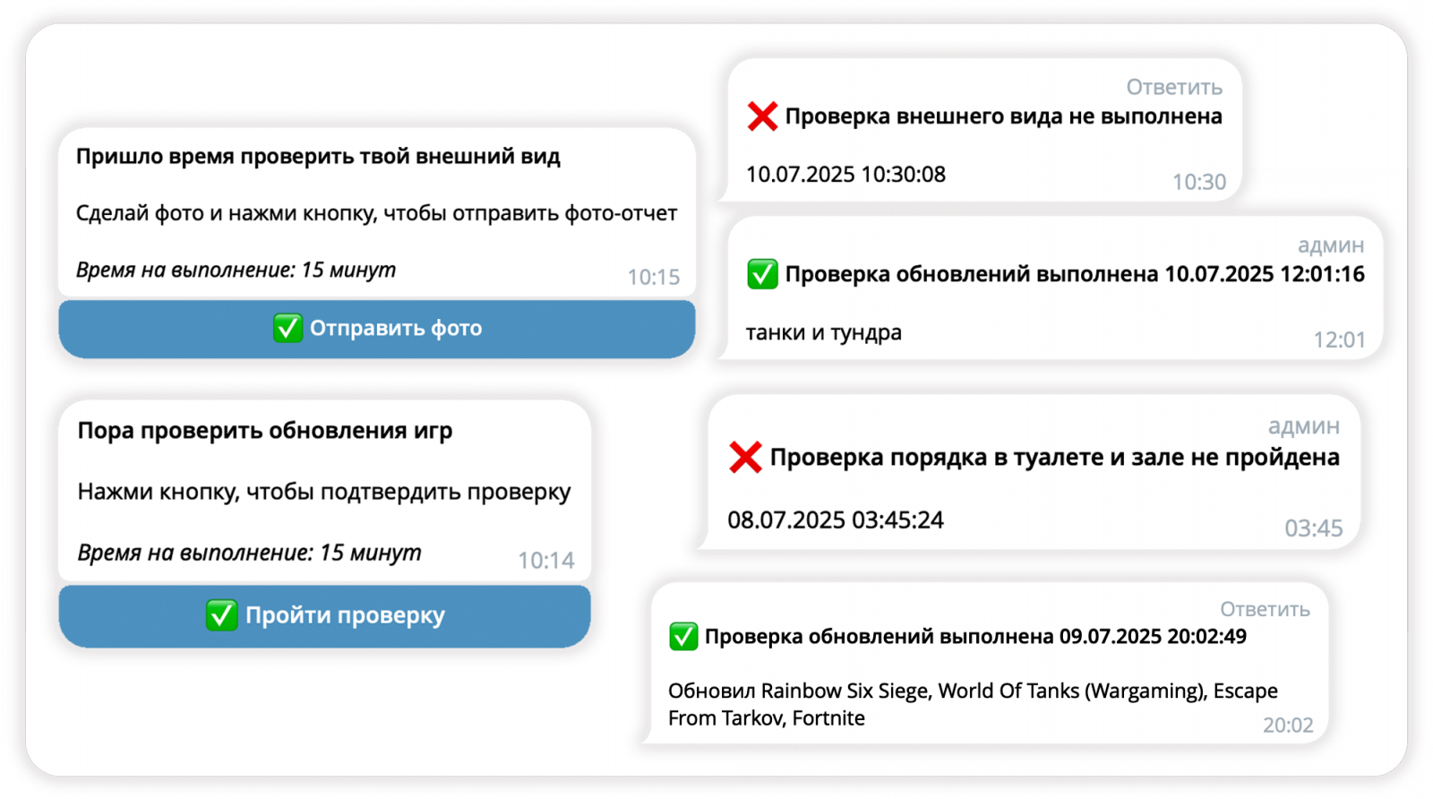 В клубе созданы три сценария и в общей сложности бот 12 раз в сутки напоминает выполнить те или иные проверки. Все эти «где бейджик?», «наведи порядок на ресепшене», «когда проверял обновления игр?» — в прошлом. Сейчас сотрудников об этом спрашивает бот и информирует, если проверка не выполнена. А значит, управляющему больше не нужно следить за сотрудниками и постоянно напоминать сделать простейшие задачи.