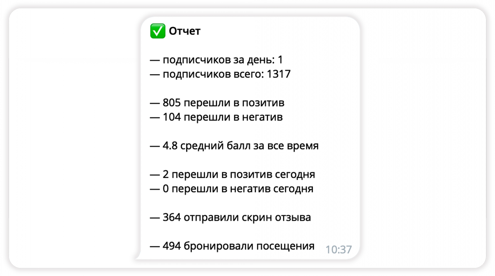 Это действительно рабочий инструмент с измеримыми результатами: рост рейтинга, увеличение количества заявок, упрощение процессов и снижение нагрузки на руководителя и команду. И всё это — легко и просто, внутри Telegram.