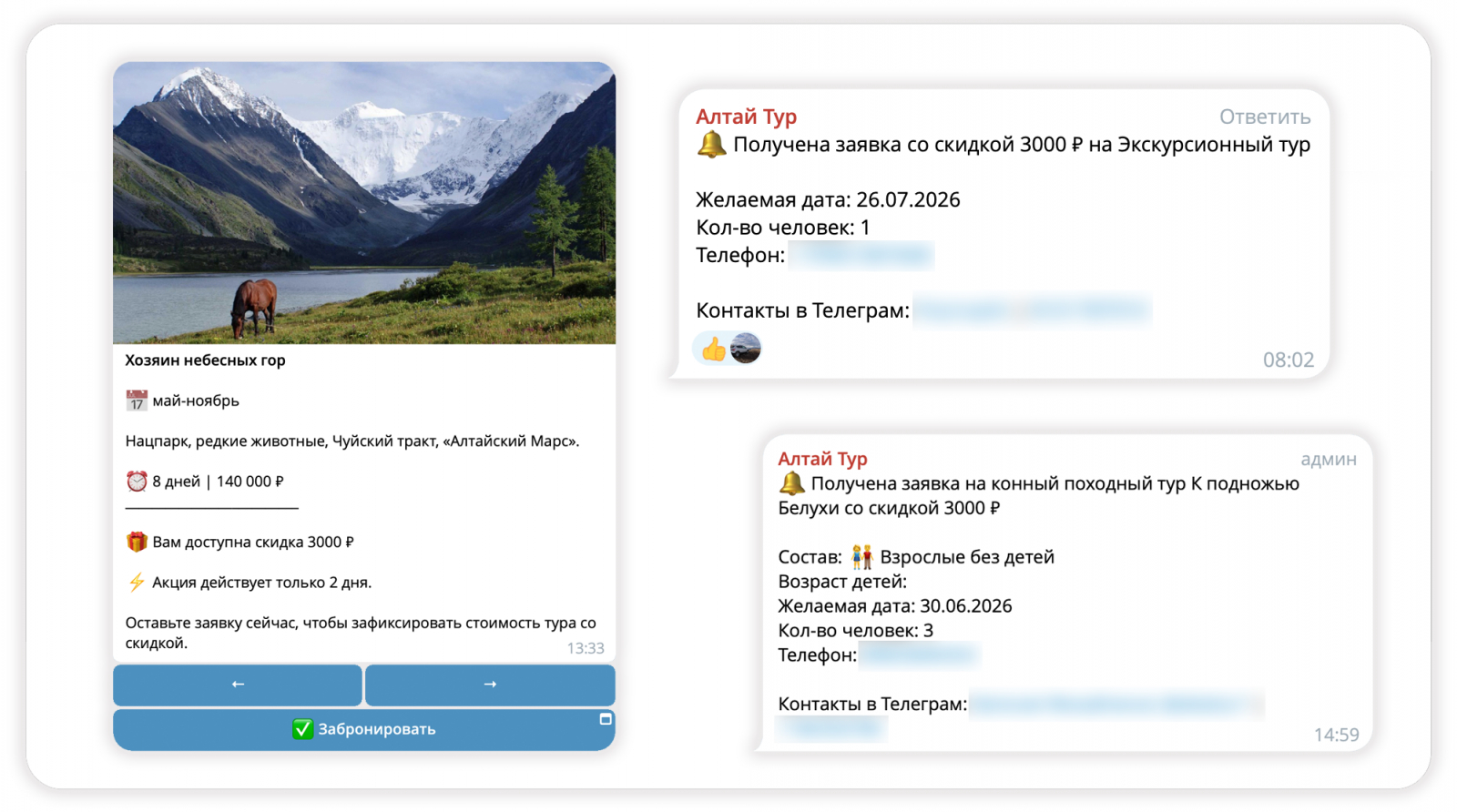 К нам обратился «Алтай-Тур», туроператор по Горному Алтаю, с задачей разработать бота для приема трафика в Telegram. Компания активно продвигается, и нужен конвертер внутри мессенджера, чтобы не уводить трафик на внешние площадки.