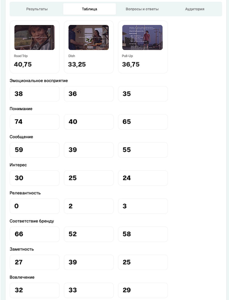 Респонденты отвечали на шкальные и открытые вопросы по восьми параметрам: эмоциональное восприятие, понятность, сообщение, интерес, релевантность, соответствие бренду, заметность и вовлечённость. Система автоматически агрегировала оценки и анализировала текстовые ответы — выделяла эмоции, темы и формировала короткие резюме.