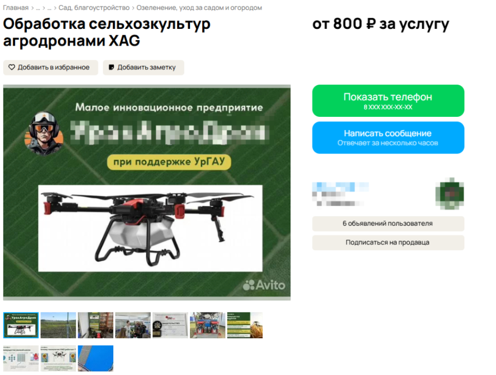 Исполнитель работает на двух дронах XAG P100 и обрабатывает 200–300 Га в сутки.