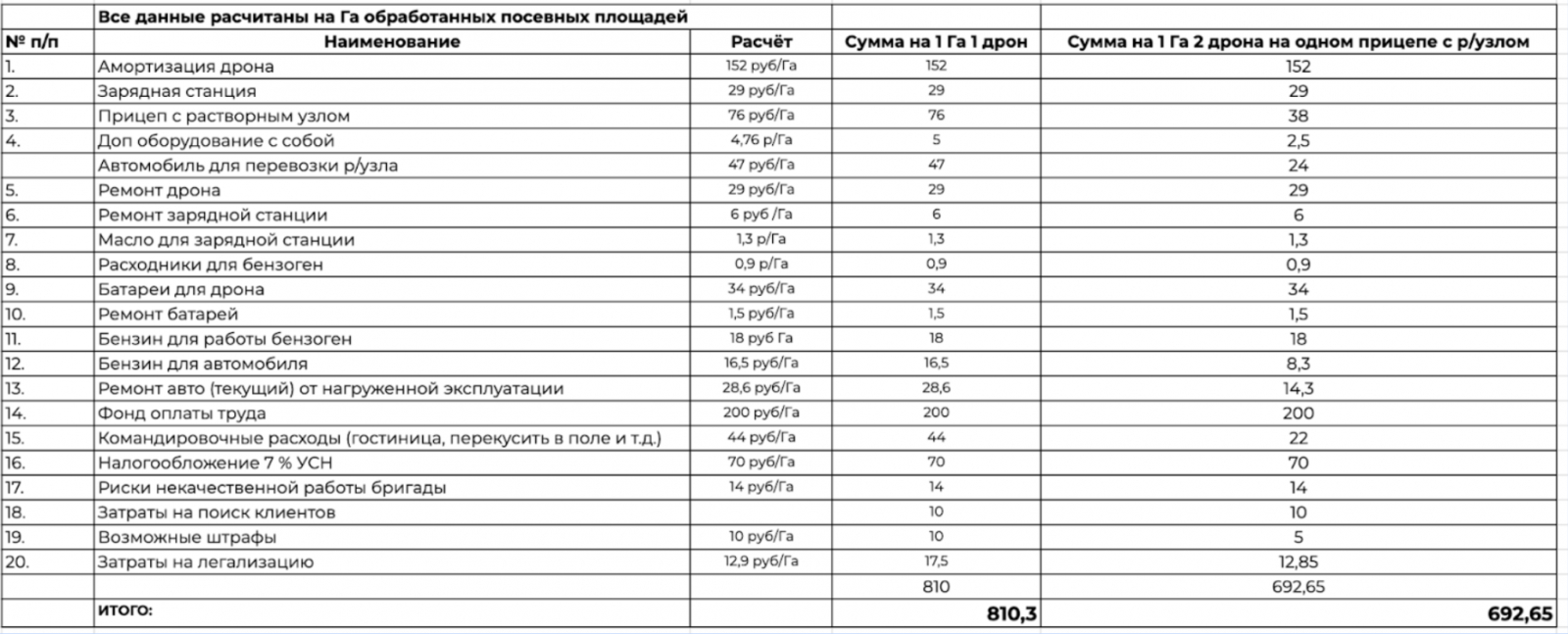 Расчет себестоимости обработки агродроном в таблице: