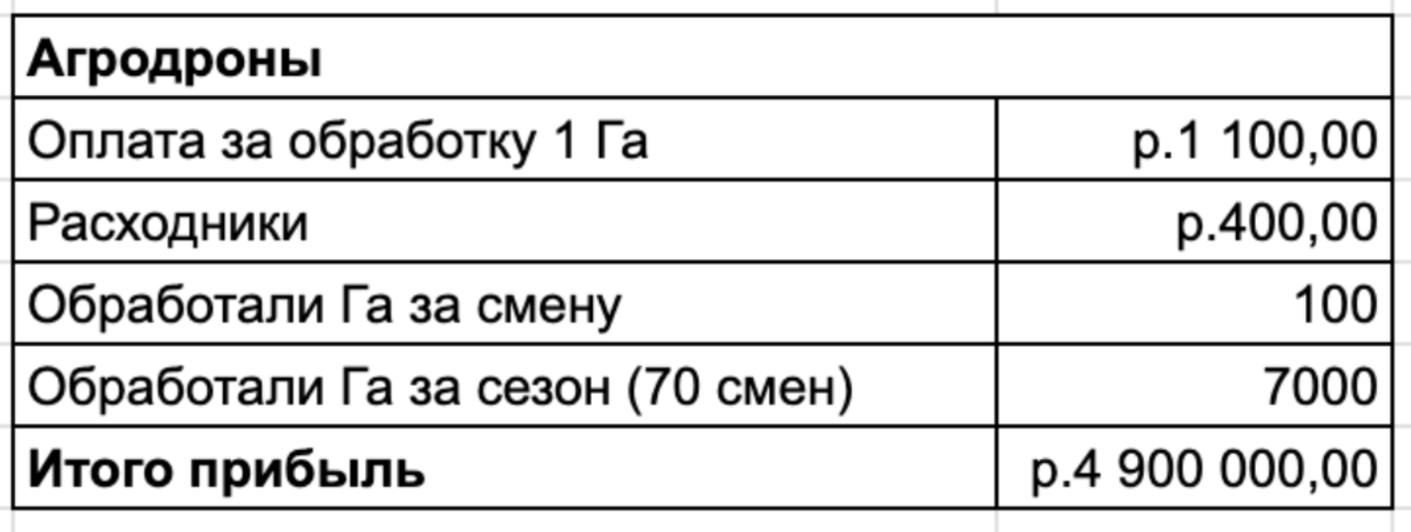 Окупаемость — 1 сезон. После этого дрон начинает приносить чистую прибыль.