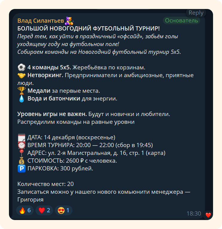 Боль №2: мероприятия — это рутина. Процесс выглядел просто, но съедал часы. Сначала публикуется анонс, потом участники пишут в личку, чтобы записаться. Дальше начинается рутина: собрать список, никого не забыть, напомнить, пересчитать. Если кто-то выпал — внести изменения.
