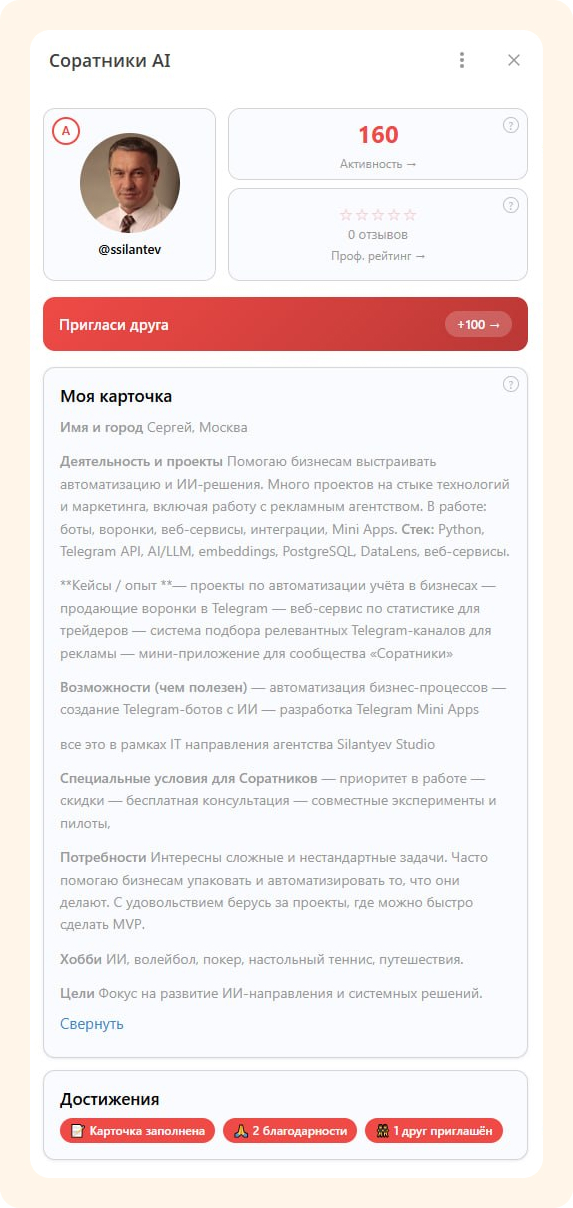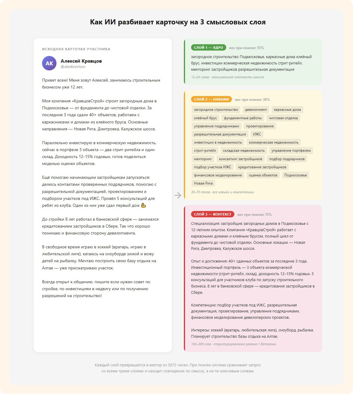 Мы с Владом постоянно общаемся, и в этом общении всегда рождается что-то интересное. До этой разработки мы уже делали похожий проект - парсер Телеграм-каналов. Там использовался тот же подход: семантический поиск через векторы, а не по ключевым словам.Когда пришла задача для "Соратников", решение пришло быстро. Единственное, что потребовало доработки - карточки участников. Люди пишут по-разному: кто-то кратко о деле, кто-то много про хобби и футбол. Как искать по таким текстам?Мы разделили каждую карточку на три уровня. И потом всё это собрали в один пазл. Теперь поиск работает точно: по короткому ядру - 55% веса, по описанию основных компетенций - 30%, по контексту - 15%. Так система находит нужно человека, даже если в его карточке нет точного ключевого слова.
