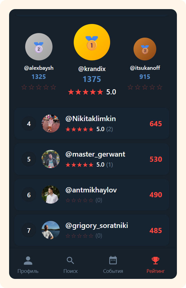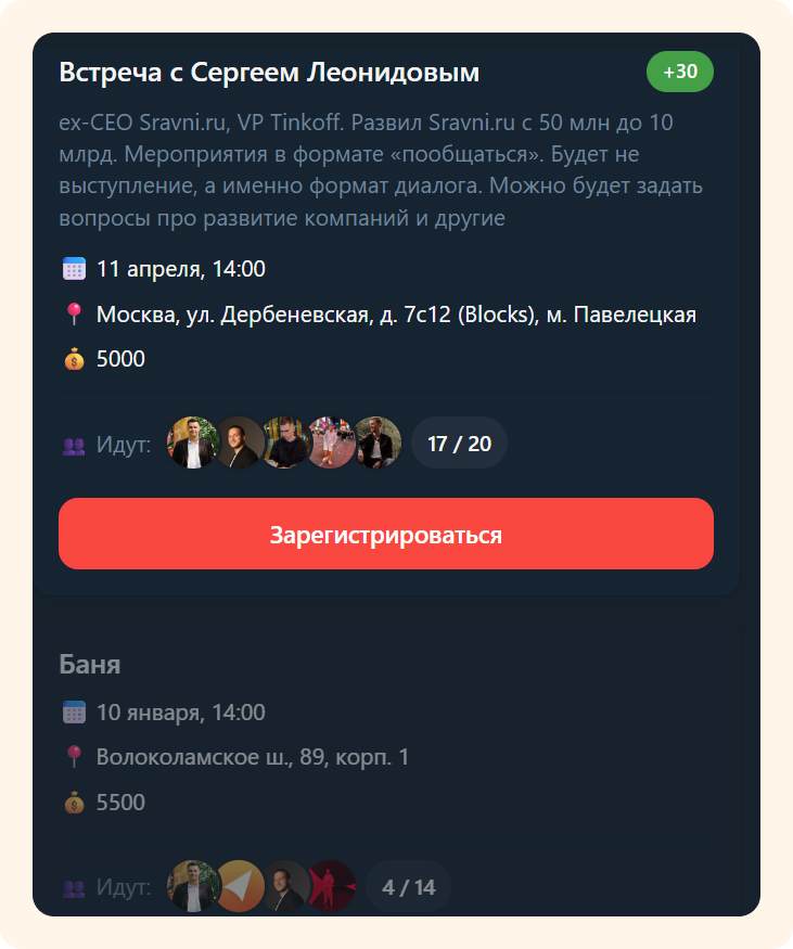 Боль №3: нет прозрачной системы активности. В сообществе ценится участие: помощь другим, организация встреч, вовлечённость. Чтобы поощрять это, мы сделали систему баллов активности. Она давала привилегии: высокий рейтинг повышал шансы попасть на закрытое мероприятие и служил сигналом доверия — активный участник считался надёжным.