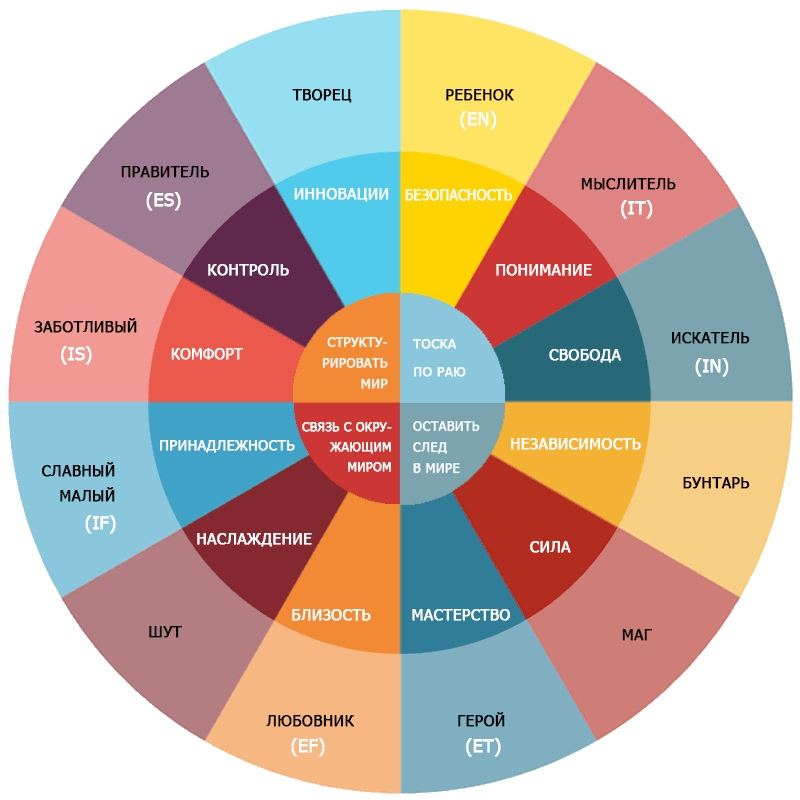 Карл Густав Юнг ввел понятие архетипов — универсальных образов, живущих в коллективном бессознательном. В брендинге это 12 готовых «ролей», которые вызывают у аудитории определенную эмоциональную реакцию: Герой, Мудрец, Шут, Любовник, Бунтарь, Заботливый, Правитель и др. Названия могут варьироваться, но характер остается.