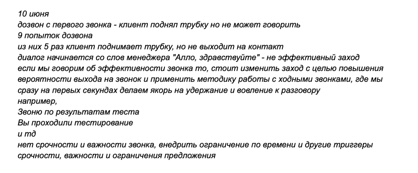 Возьмем такой пример. По одному клиенту за месяц пришло 470 лидов, и 435 из них оказались «недозвонами». На первый взгляд ужас: лиды плохие, номера битые, трафик никуда не годится. Но когда мы копнули глубже, оказалось, что около 15% этих лидов реально дозвонные. Дело в том, что менеджеры не умеют работать с возражениями, закрывают звонок слишком рано или не фиксируют данные в CRM.