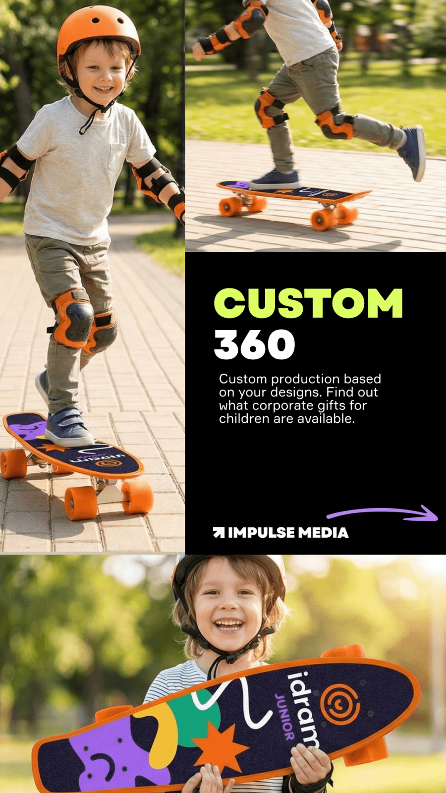 Итак, начнем с детских подарков. Как вам идея со скейтбордом? Мы производим скейтборды на заказ партиями от 100 штук. Стоимость варьируется от $15 до $45 в зависимости от конфигурации. Сроки вас приятно удивят, ведь мы справимся всего за 4-5 недель.