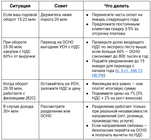 Важно: доход на УСН учитывается кассовым методом, когда деньги поступили, а не когда отгрузили товар. Если в декабре 2026 года оборот 19,5 млн, а клиент должен перечислить 1 млн, попросите его заплатить после 10 января 2027-го. В 2026 году останетесь без НДС, в 2027-м придется платить, но будет время подготовиться.