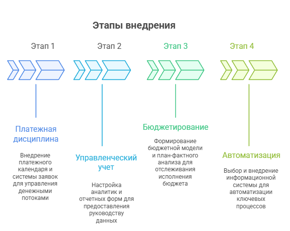 Создание системы управления финансами удобнее рассматривать как последовательность шагов, а не один большой проект. Такой подход снижает нагрузку на команду и позволяет фиксировать результат после каждого этапа