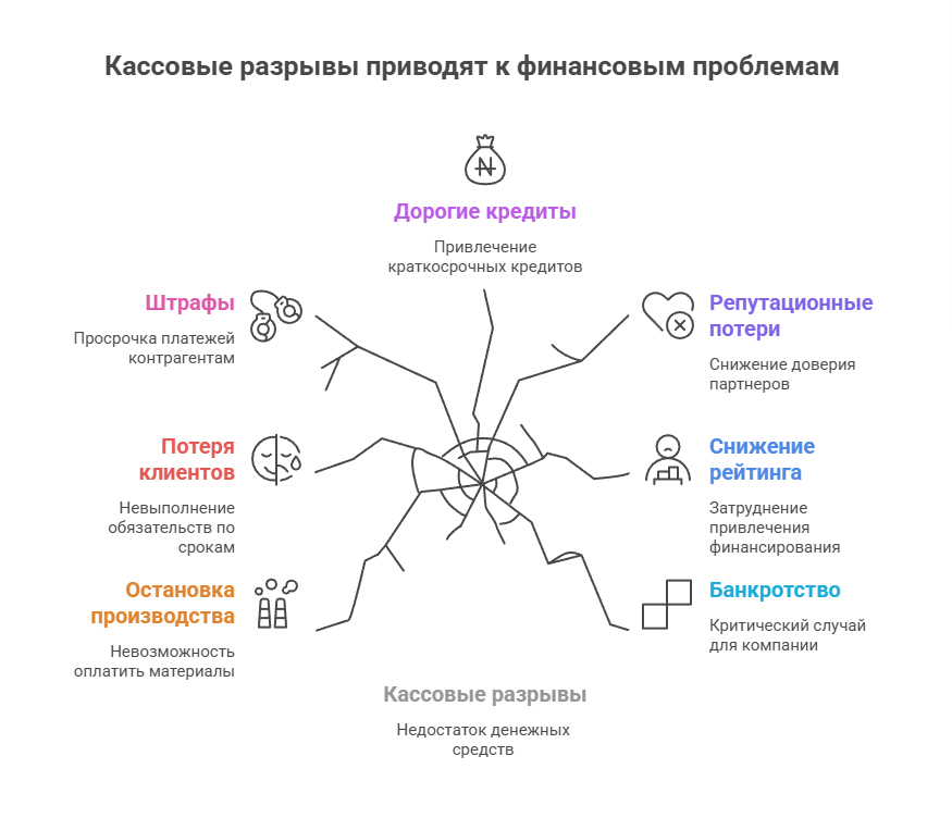 Компания показывает прибыль в отчетности, выполняет план продаж, но не может оплатить поставщику срочную партию сырья. Или переносит выплату зарплаты на три дня, пока не поступит платеж от крупного клиента. Ситуация, когда деньги есть «на бумаге», но их нет на счетах в нужный момент — кассовый разрыв.