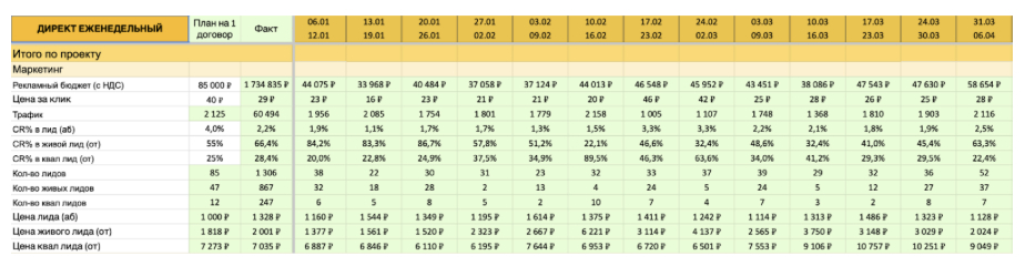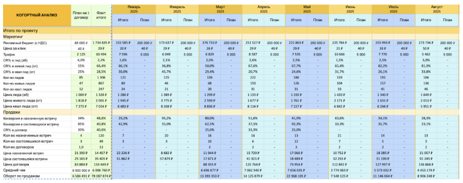 Все результаты фиксируются в таблице когортного анализа, которая позволяет видеть, как клиенты проходят путь от первого обращения до заключения договора, а также отслеживать реальную окупаемость рекламных вложений.