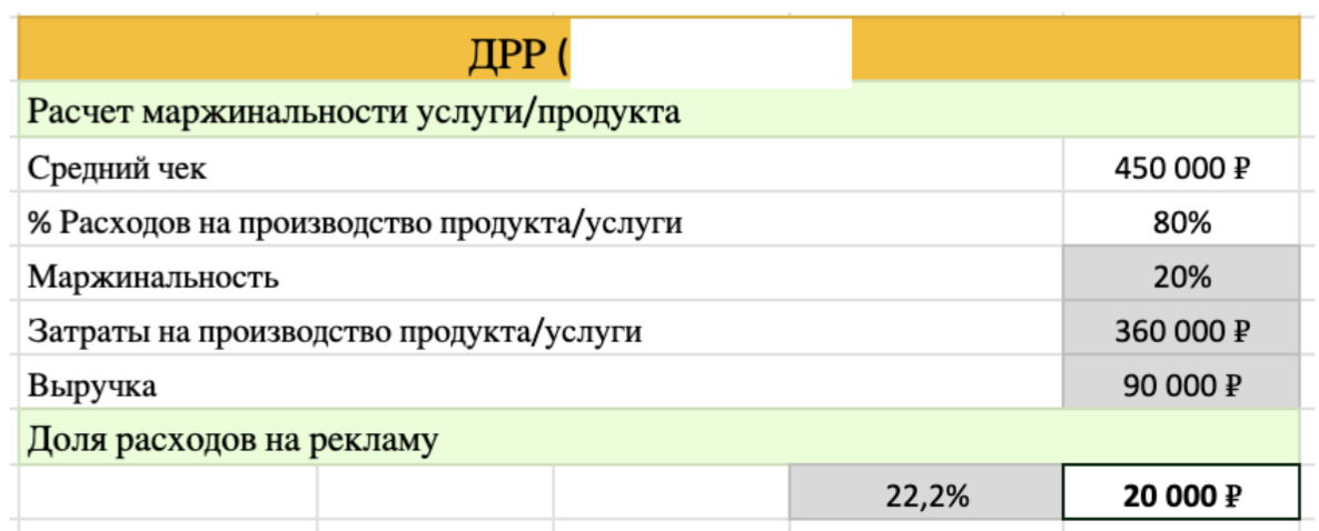 Расчет модели ведется при среднем чеке 450 000 ₽ и маржинальности 20% (затраты на производство — 360 000 ₽, прибыль с единицы продукции — 90 000 ₽). При этом рекламные затраты на один договор — 20 000 ₽, что составляет около 22,2% от выручки. Такой баланс делает проект экономически устойчивым и дает запас прочности для масштабирования.