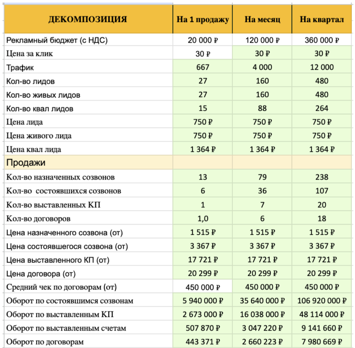 На 3 месяца: при общем бюджете 360 000 ₽ планируется заключить 18 договоров, подготовить 20 коммерческих предложений, провести 107 целевых консультаций и привлечь 264 квалифицированных лида. Ориентировочная выручка составит 7 980 669 ₽.
