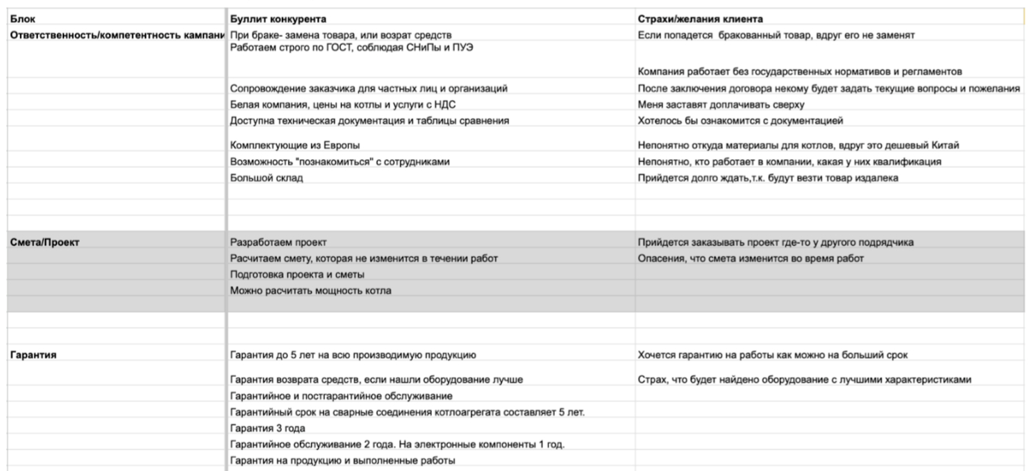 Мы собрали и систематизировали рекламные материалы конкурентов: Поиск и РСЯ в Яндекс.Директ, баннерные объявления, тексты, заголовки и визуальные креативы. Многие конкуренты не показывают реальные преимущества и характеристики котлов, что дает возможность усилить оффер. Большинство сайтов не используют калькулятор мощности и онлайн-квиз, что снижает конверсию — мы сделали эти элементы ключевыми на нашем сайте.