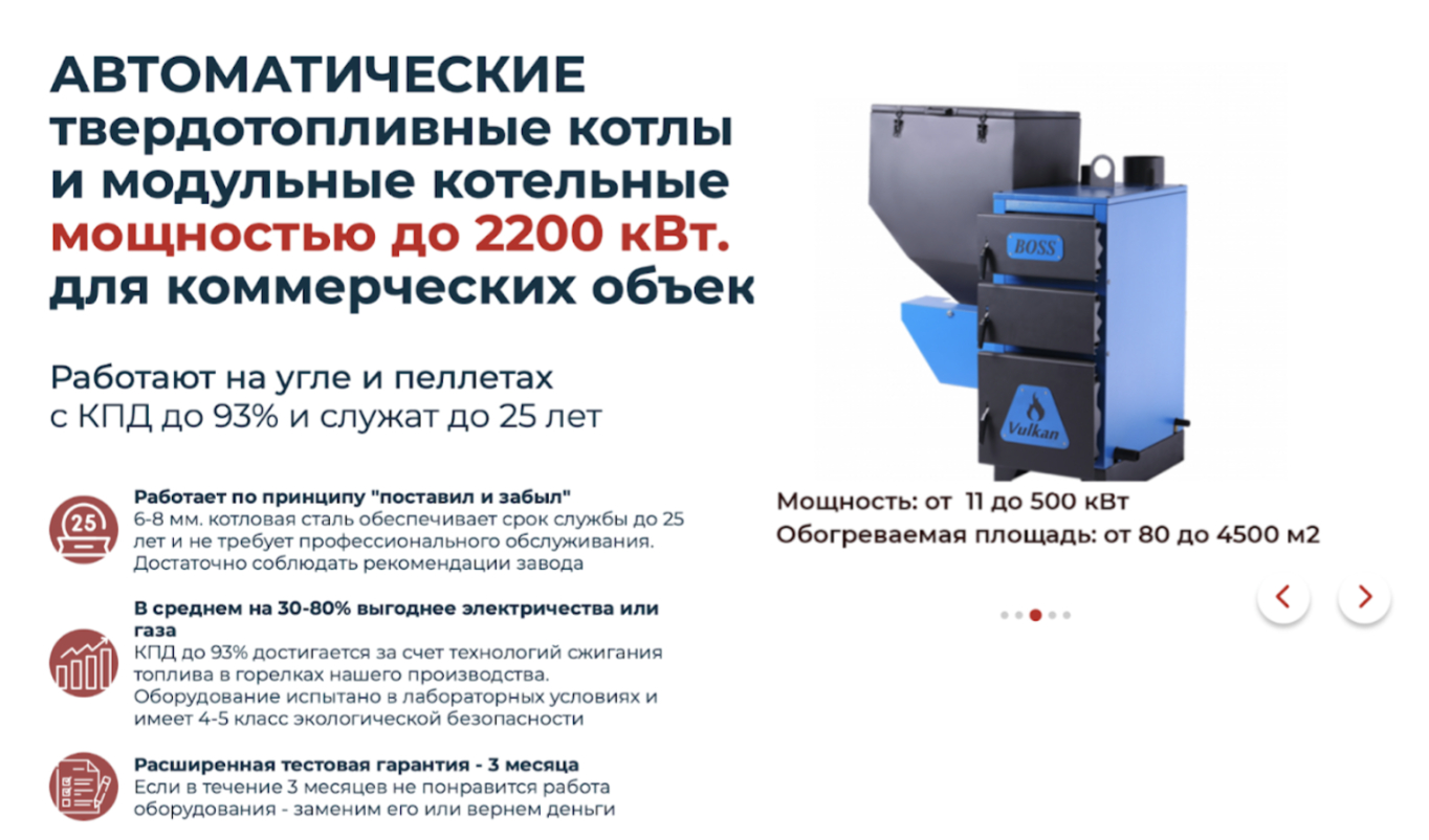 Клиент — производственный завод, выпускающий автоматические твердотопливные котлы. Компания работает по всей России, делая упор на энергоэффективность и долговечность оборудования. На момент обращения клиент хотел увеличить количество прямых заявок с сайта и получить предсказуемую систему продаж, а не разовые сделки через рекомендации или дистрибьюторов.