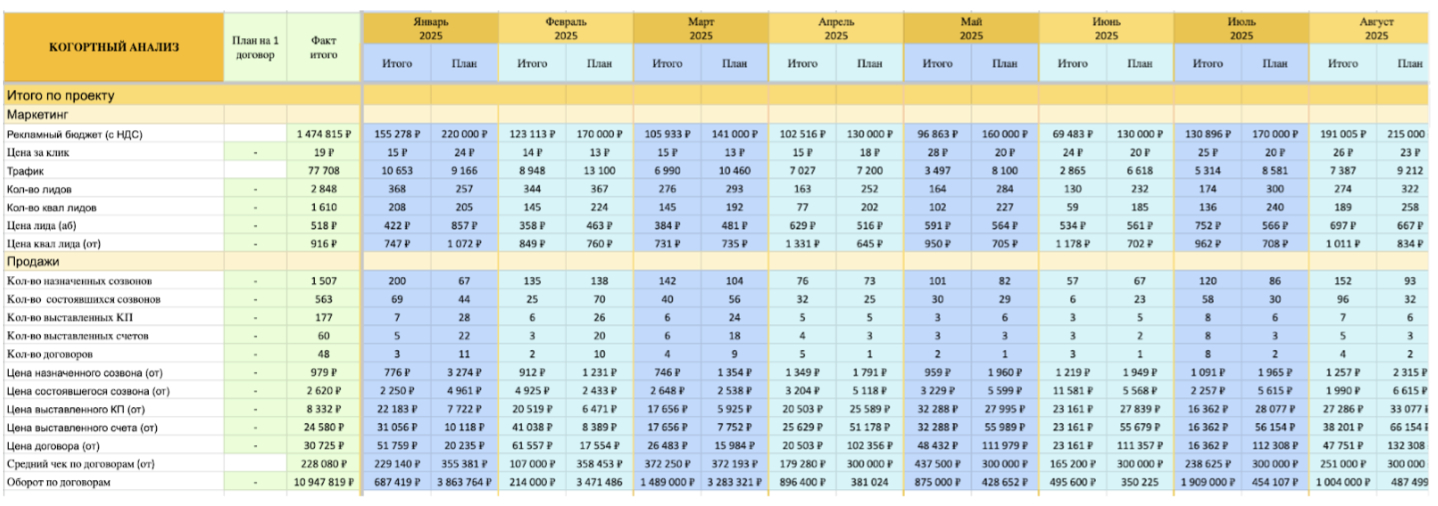 Такой анализ показал эффективность рекламных кампаний, позволил выявить неэффективные каналы, и с помощью оптимизации бюджета увеличить отдачу на каждый лид и договор.