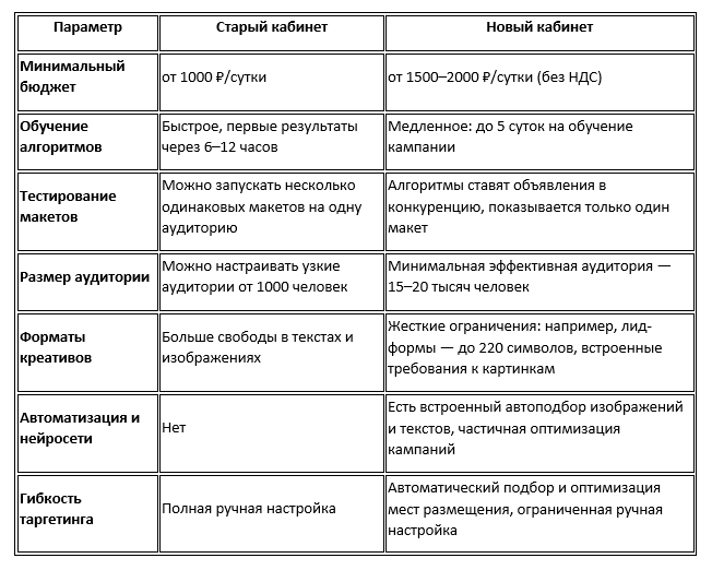· B2B: ограниченные аудитории, глубокий таргетинг по должностям и компаниям. Старый кабинет удобен для точечных кампаний.