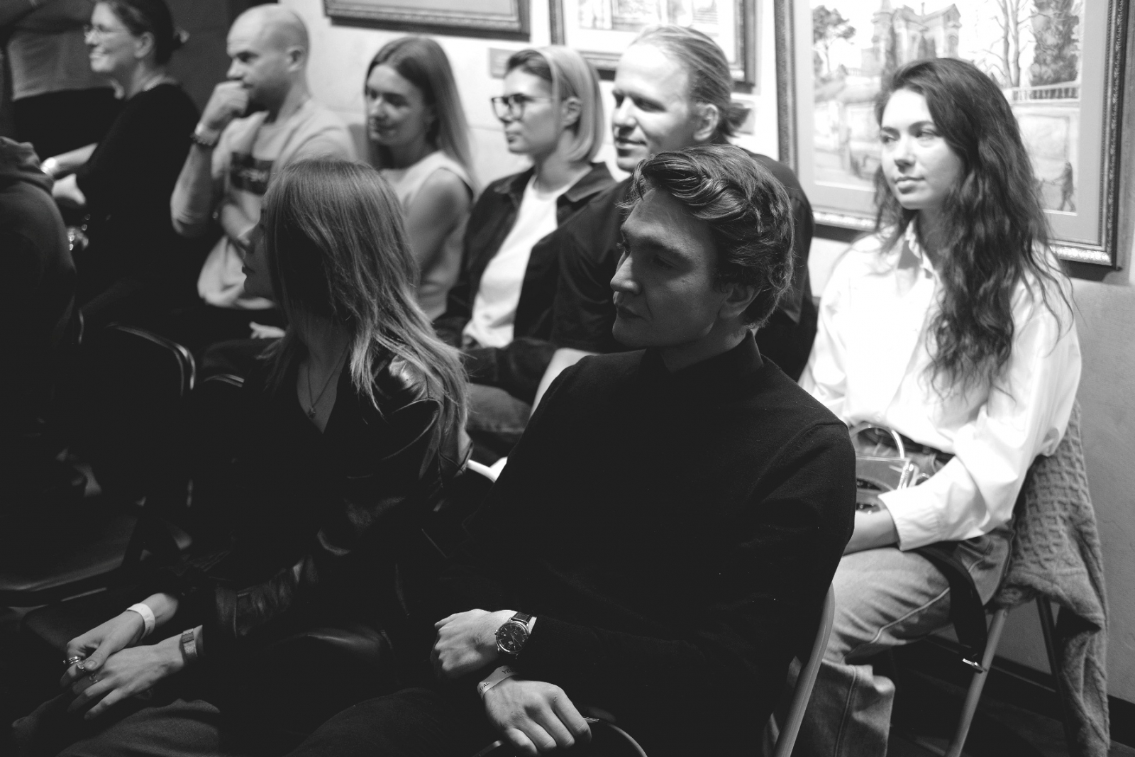 Особую атмосферу вечера поддержал куратор и PR-директор ZARENKOV GALLERY Андрей Чирков. Его энергия и умение выстраивать диалог с аудиторией задали тон мероприятию. В рамках программы он провел короткую экскурсию по текущей экспозиции – выставке «Здесь рождаются таланты», ставшей примером того, как искусство объединяет города, поколения и людей, говорящих на одном языке – языке творчества.