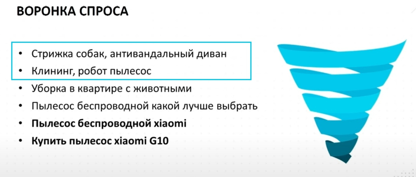 Самые горячие запросы находятся в самом узком месте воронки, когда люди уже ищут продукт. Например, «купить пылесос Xiaomi Mi Robot Vacuum». Здесь будет не статья, а лендинг или карточка товара.