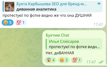 В ТГ-канале «Бухта Карбышева» на серьёзных щах обсуждаем SEO и контент, бухтим по поводу нейронок, иронизируем по любому удачному поводу. Заходите, у нас интересно.