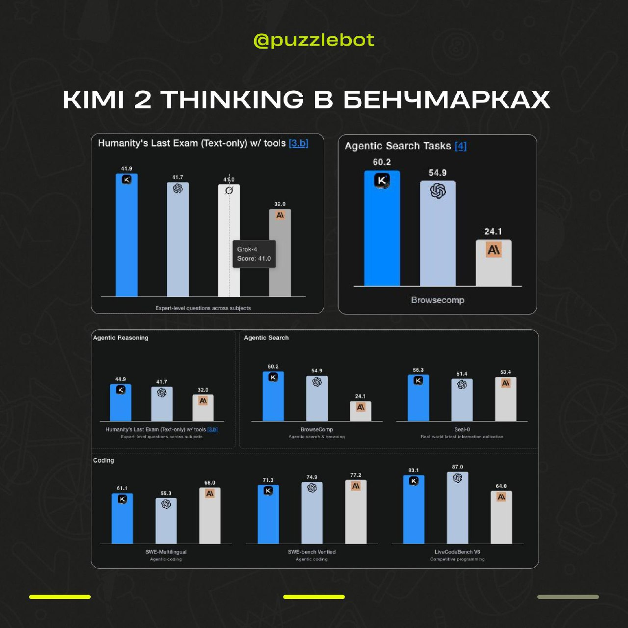 🇨🇳 Китайская компания Kimi AI представила новую открытую ИИ-модель K2 Thinking. Она превзошла другие нейросети по многим параметрам, но по программированию модель пока уступает Claude и GPT-5