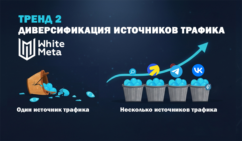 Диверсификация источников трафика — это стратегия, при которой вы привлекаете клиентов из множества каналов, а не из одного-двух. Тренд решает проблему уязвимости бизнеса к изменениям алгоритмов и колебаниям цен на рекламу.