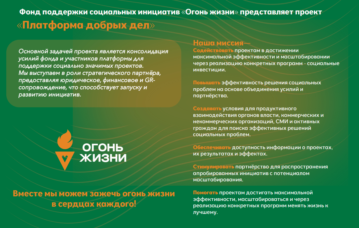 Огонь жизни — это уникальная платформа, которая объединяет некоммерческие организации, представителей бизнеса и государственных структур для решения социальных задач.