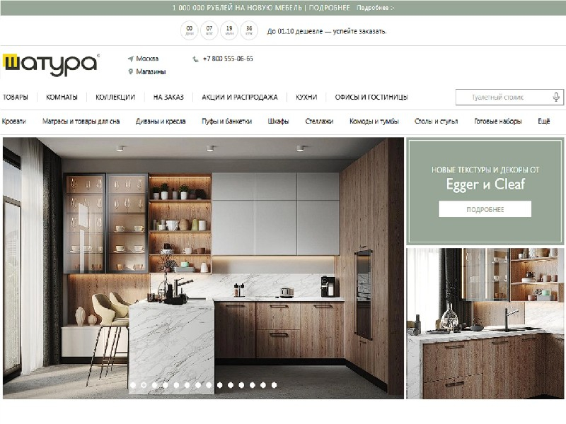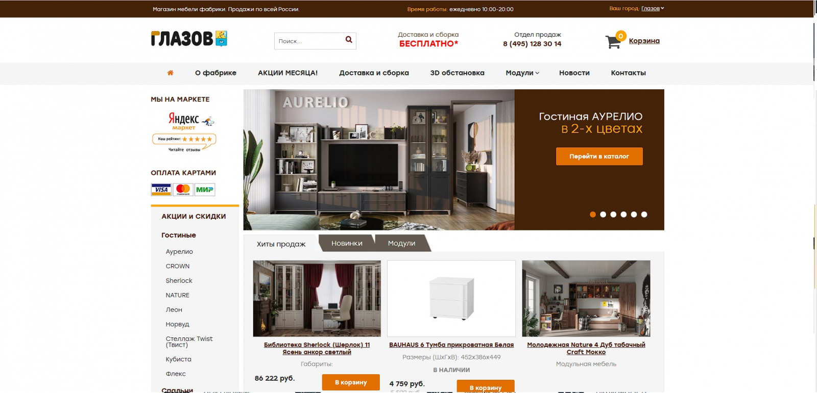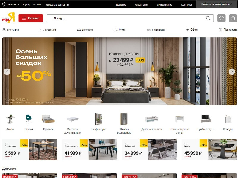 - Ассортимент: модульные системы гостиной, спальные гарнитуры, шкафы и стеллажи, кухни, детская мебель.