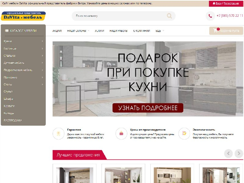 - Преимущества: выбор моделей и отделок (более 30 кухонных серий), полный цикл услуг (от проекта до монтажа), длительные гарантии (10 лет на кухни, 8 лет на шкафы), современный дизайн и участие в международных выставках.