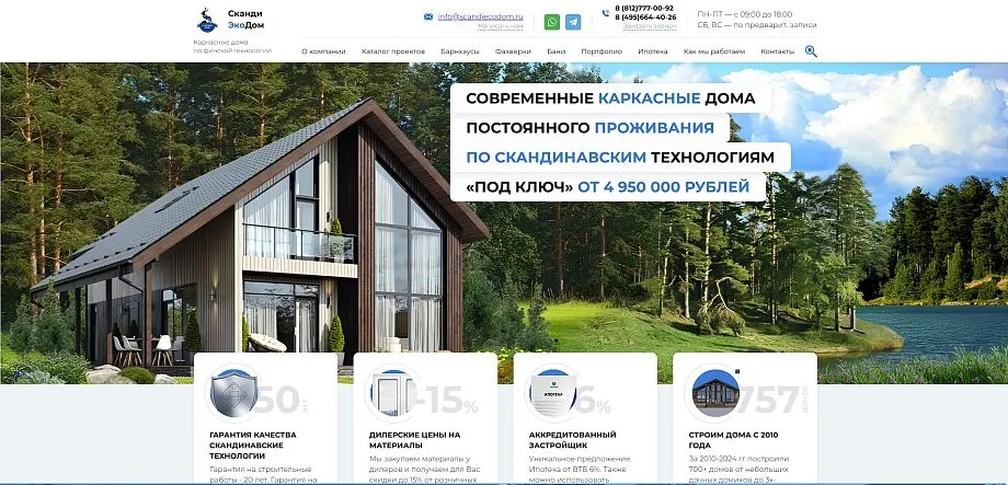 «Scandi ЭкоДом» занимается строительством современных каркасных домов по скандинавским стандартам «под ключ». С 2010 года построено более 650 домов – от маленьких дачных домиков до трёхэтажных вилл. Компания даёт 20 лет гарантии на работы; материалы рассчитаны на 50 лет эксплуатации. Предлагают три варианта комплектации (от «закрытого контура» до полной отделки).