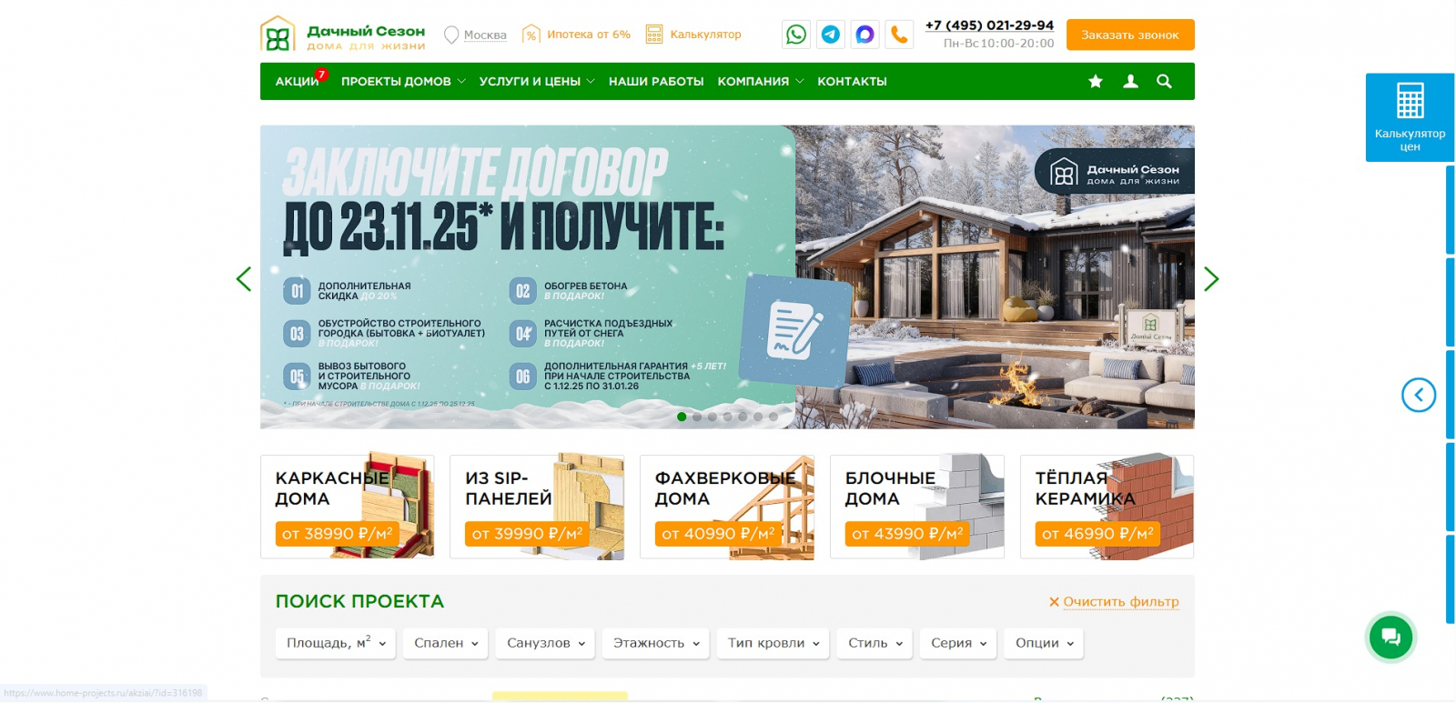 Компания «Дачный сезон» (основана в 2002) оказывает услуги по строительству каркасных домов и блочных. Предлагает дома из дерева, керамзитобетона, газобетона, кирпича и SIP-панелей. Обеспечивает полную комплектацию: возводит дом с инженерными сетями, но обычно не выполняет благоустройство участка после строительства (заборы, гаражи).