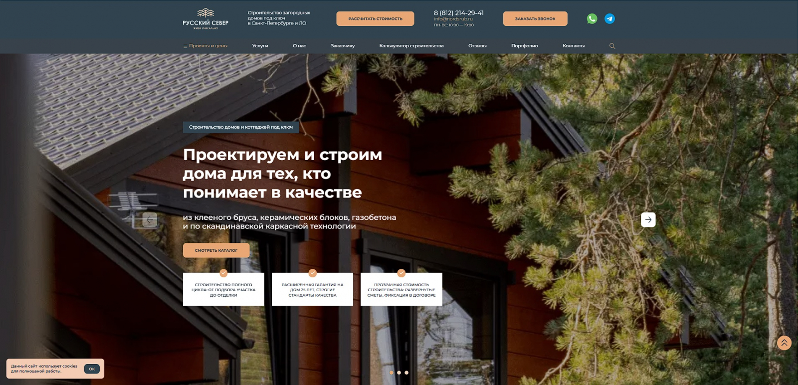 Компания «Русский Север» предлагает строительство частных загородных домов в Петербурге и пригороде. В основном возводит деревянные и комбинированные дома, реализует проекты из клееного бруса, каркасные и комбинированные конструкции. У компании собственное производство пиломатериалов и штат проектировщиков.