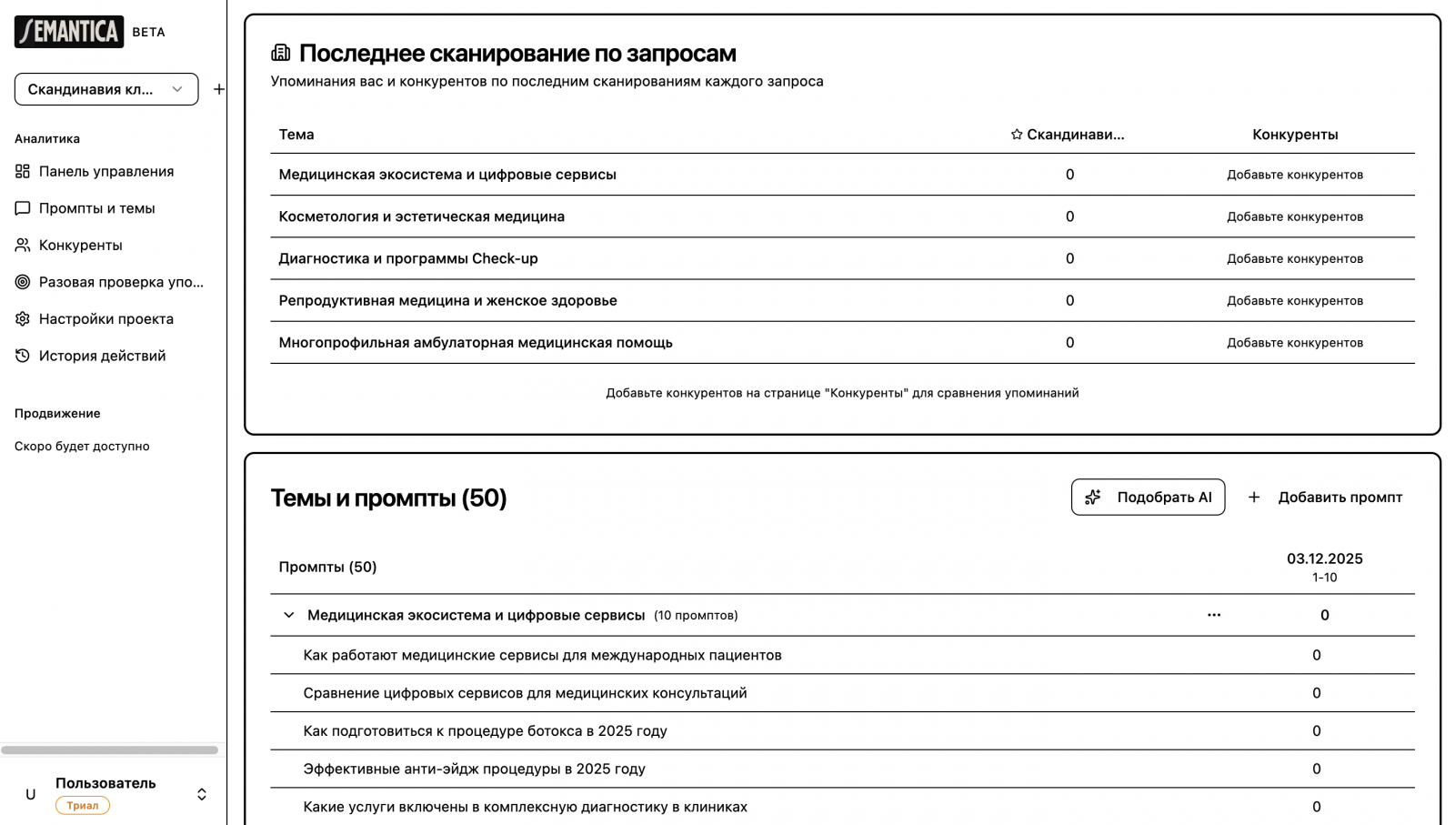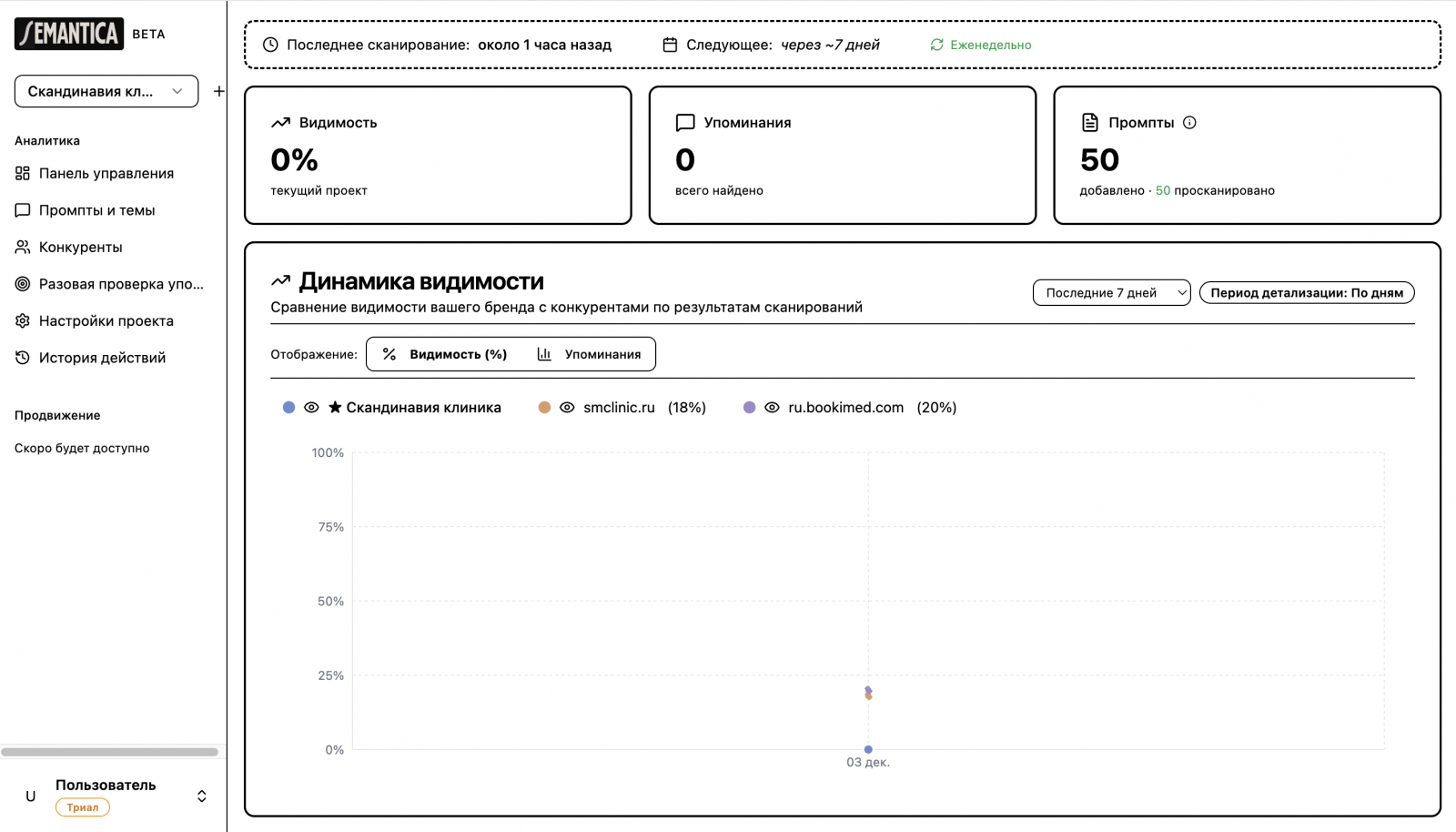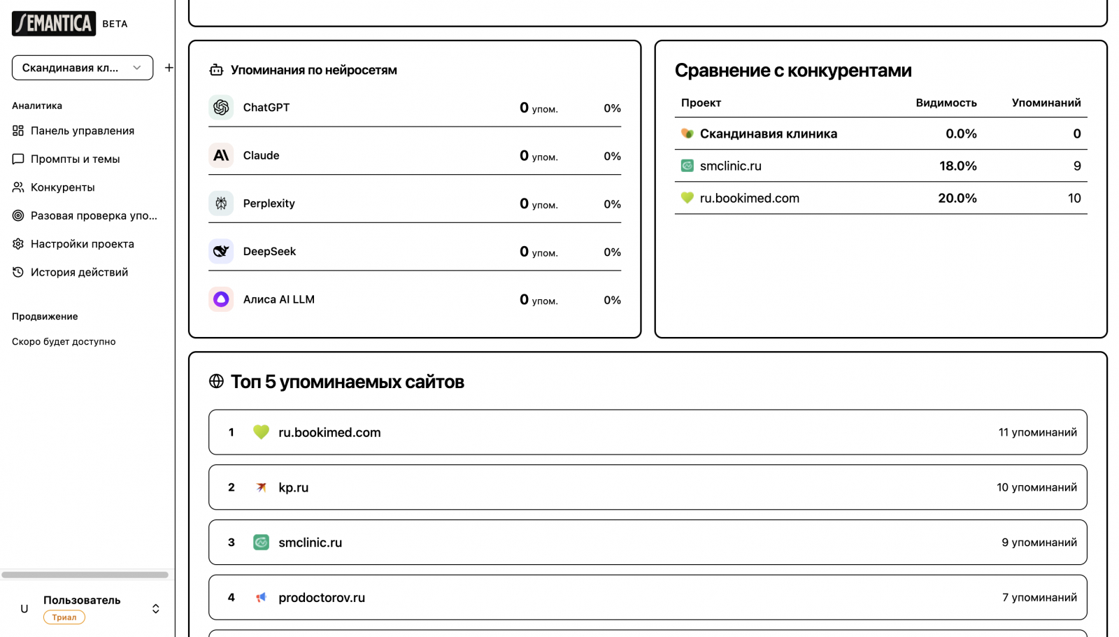 AI Semantica — российский сервис аналитики упоминаний, который помогает брендам контролировать свою видимость в генеративных поисковых системах. Платформа сканирует ответы популярных нейросетей по заданному списку запросов и фиксирует, в каких ответах упоминается сайт клиента либо сайты конкурентов.
