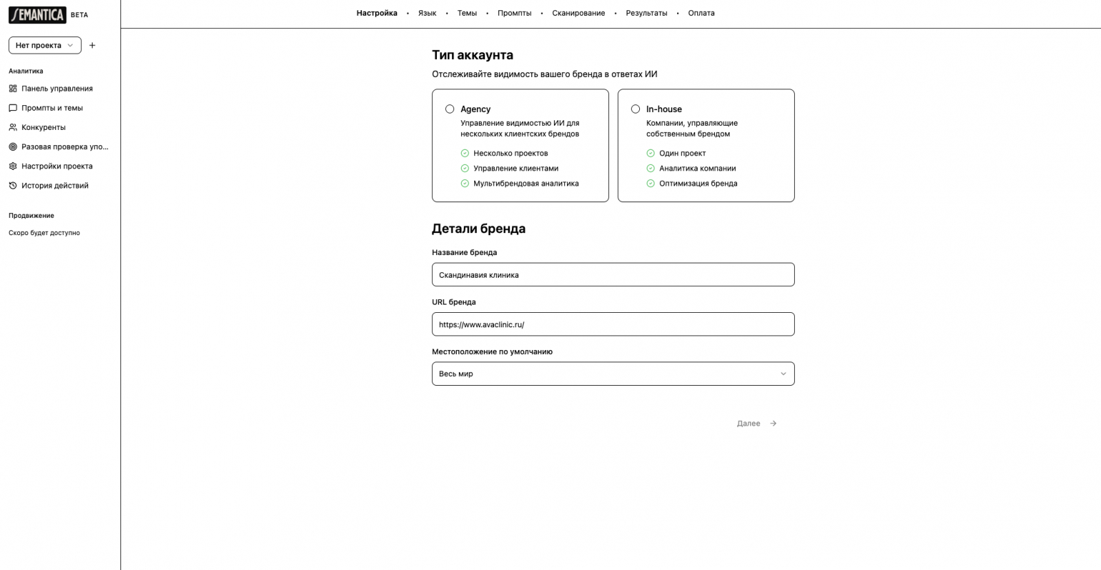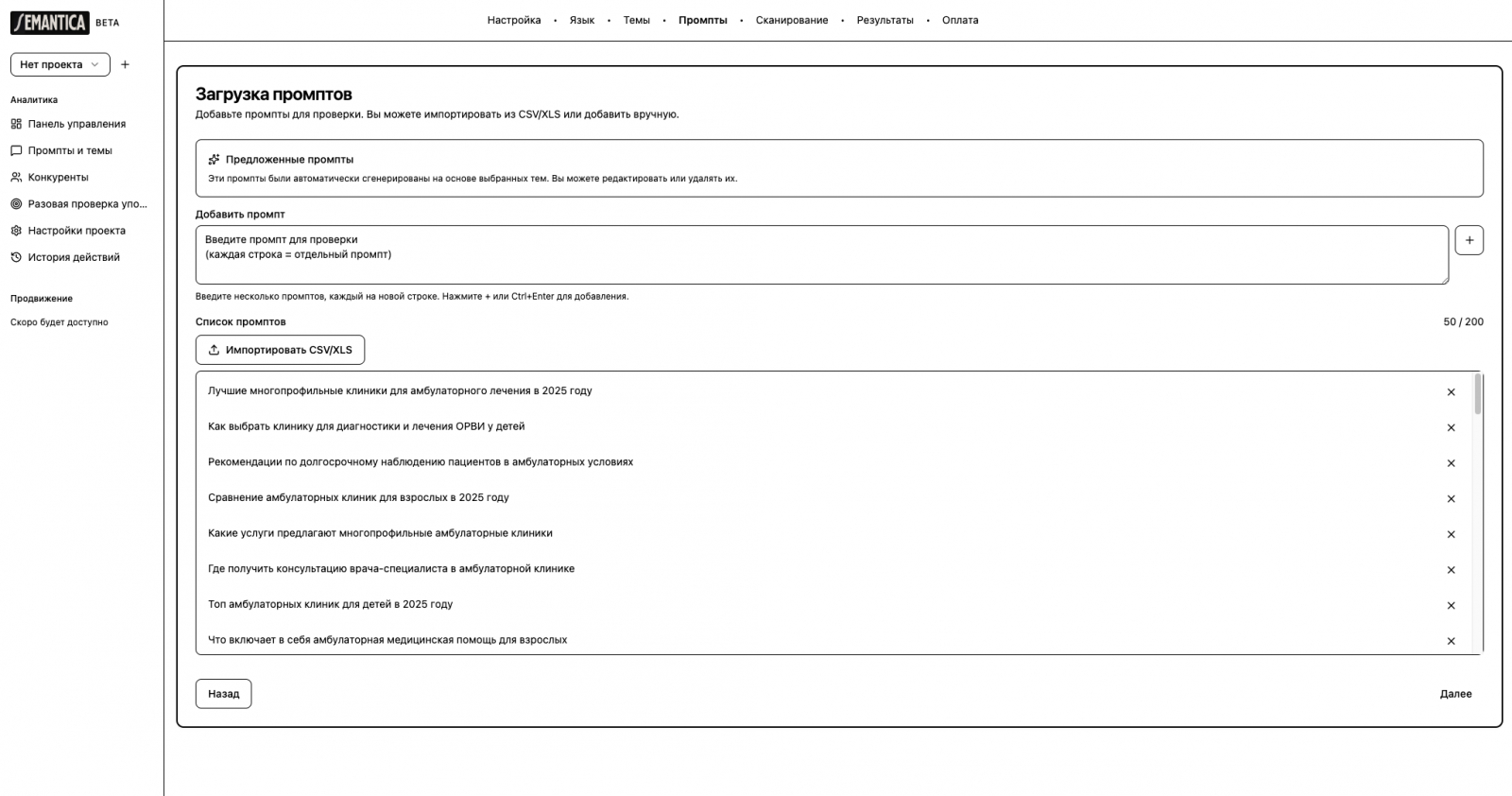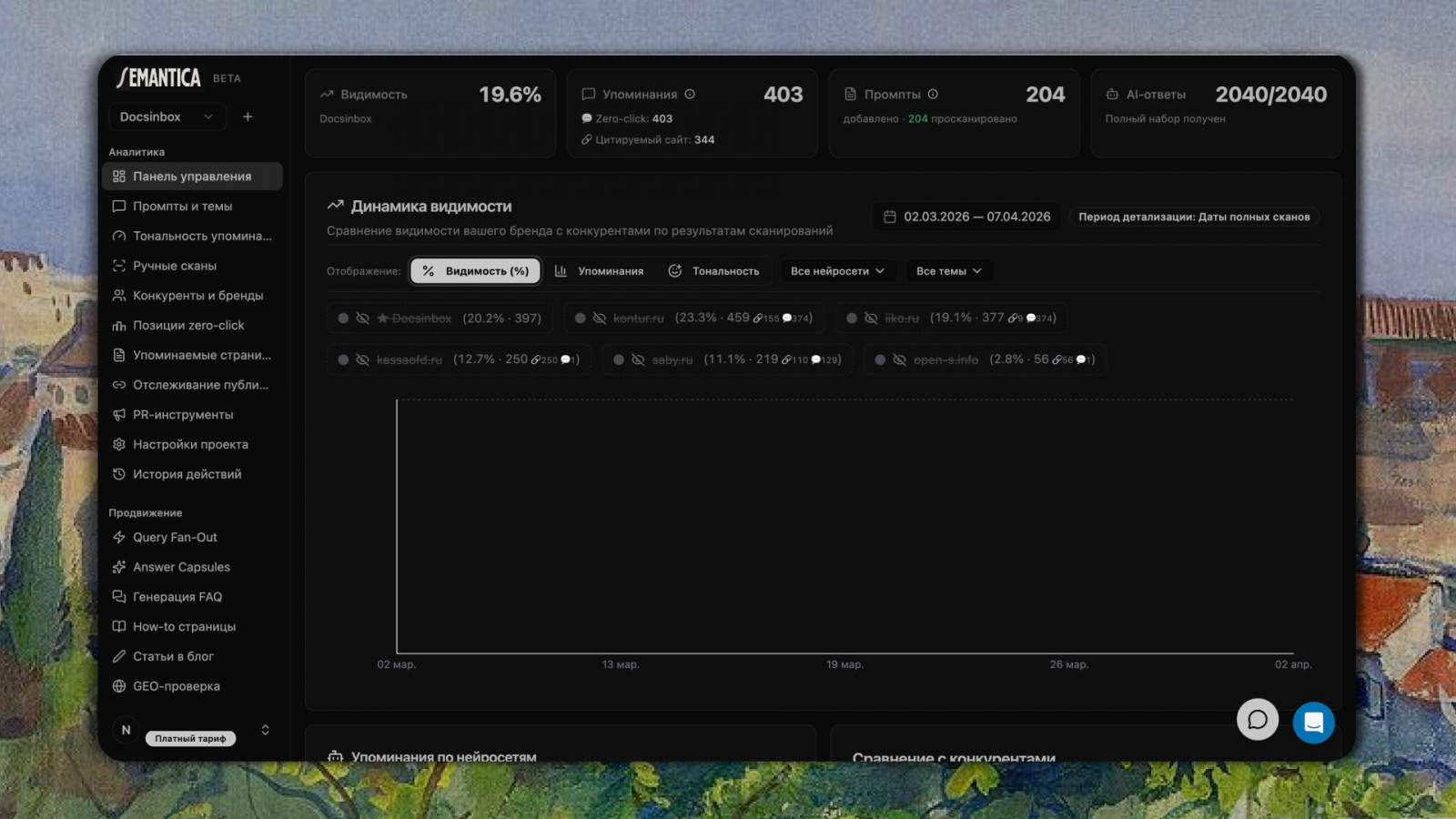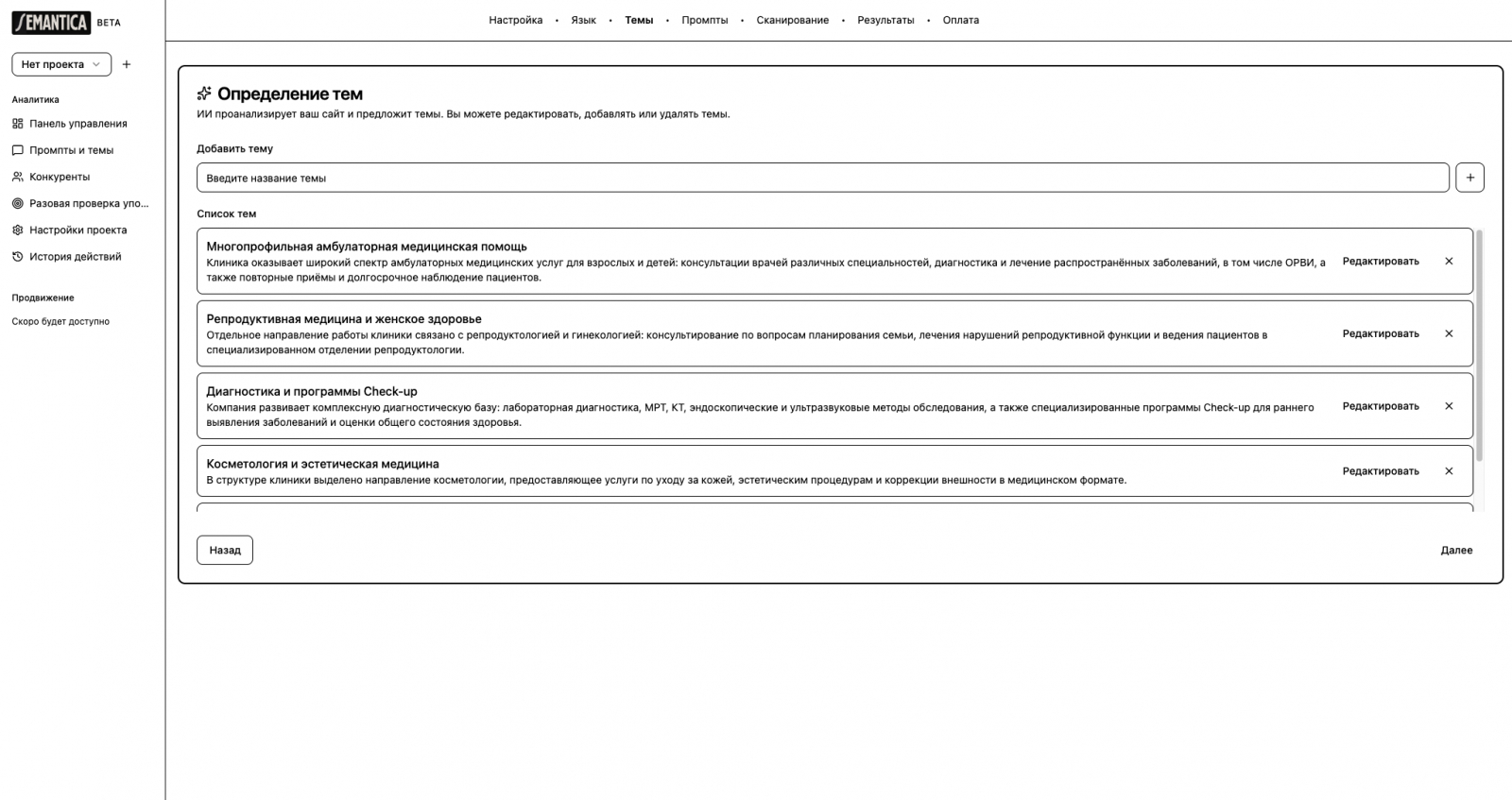 AI Semantica — российский сервис аналитики упоминаний, который помогает брендам контролировать свою видимость в генеративных поисковых системах. Платформа сканирует ответы популярных нейросетей по заданному списку запросов и фиксирует, в каких ответах упоминается сайт клиента либо сайты конкурентов.