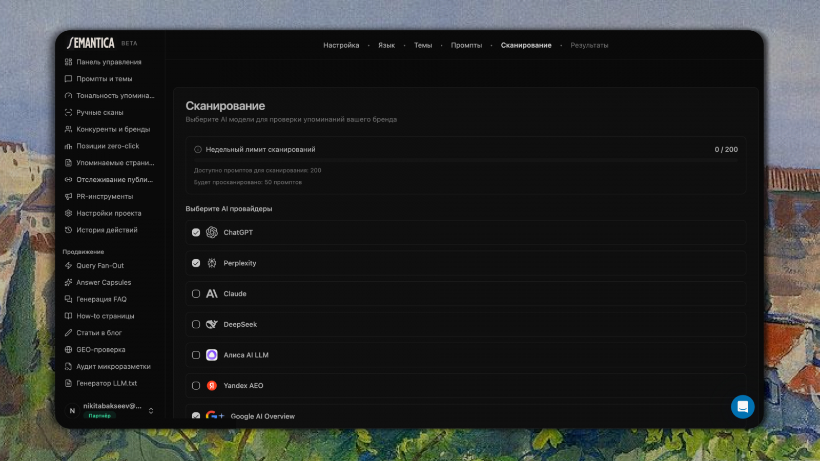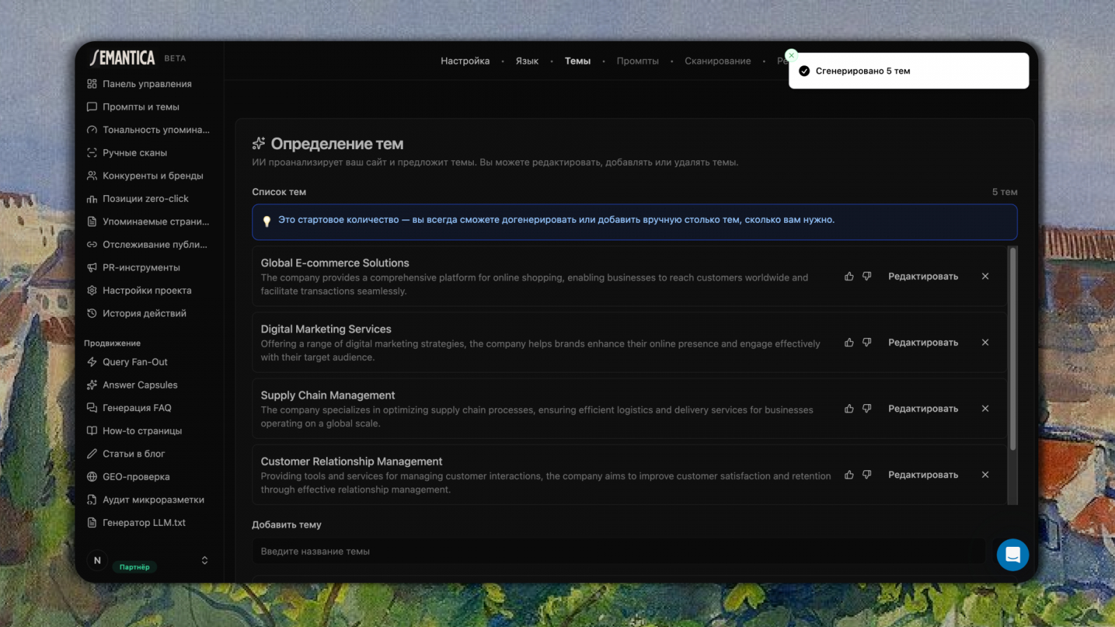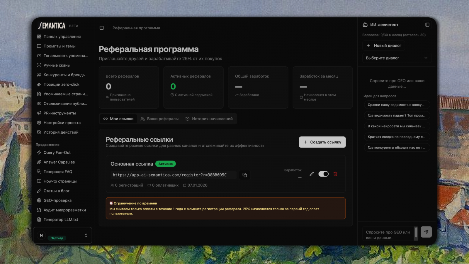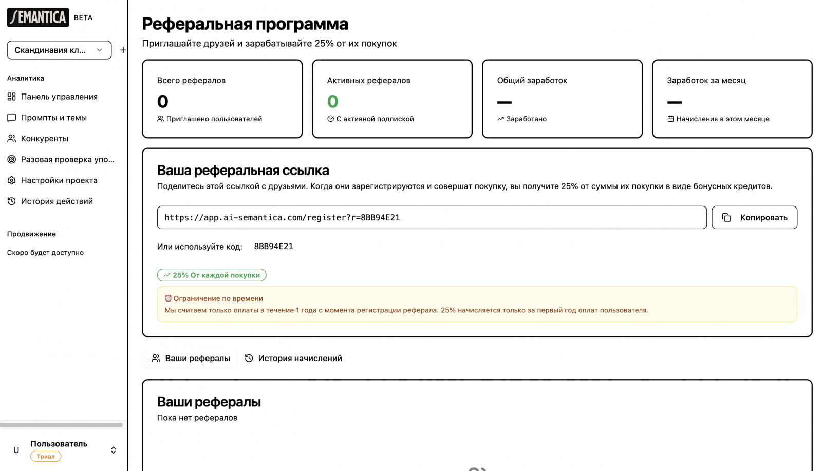 Это делает AI Semantica привлекательным решением не только для мониторинга собственной видимости, но и как инструмент для создания дополнительного дохода через партнерскую программу.