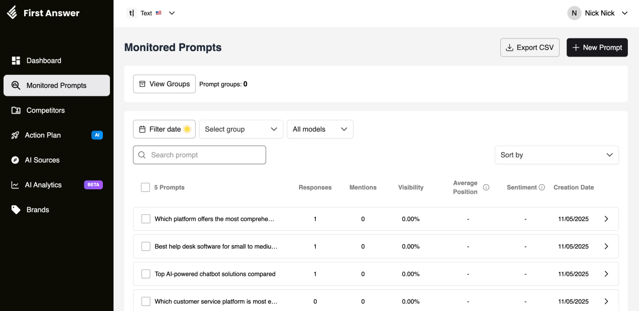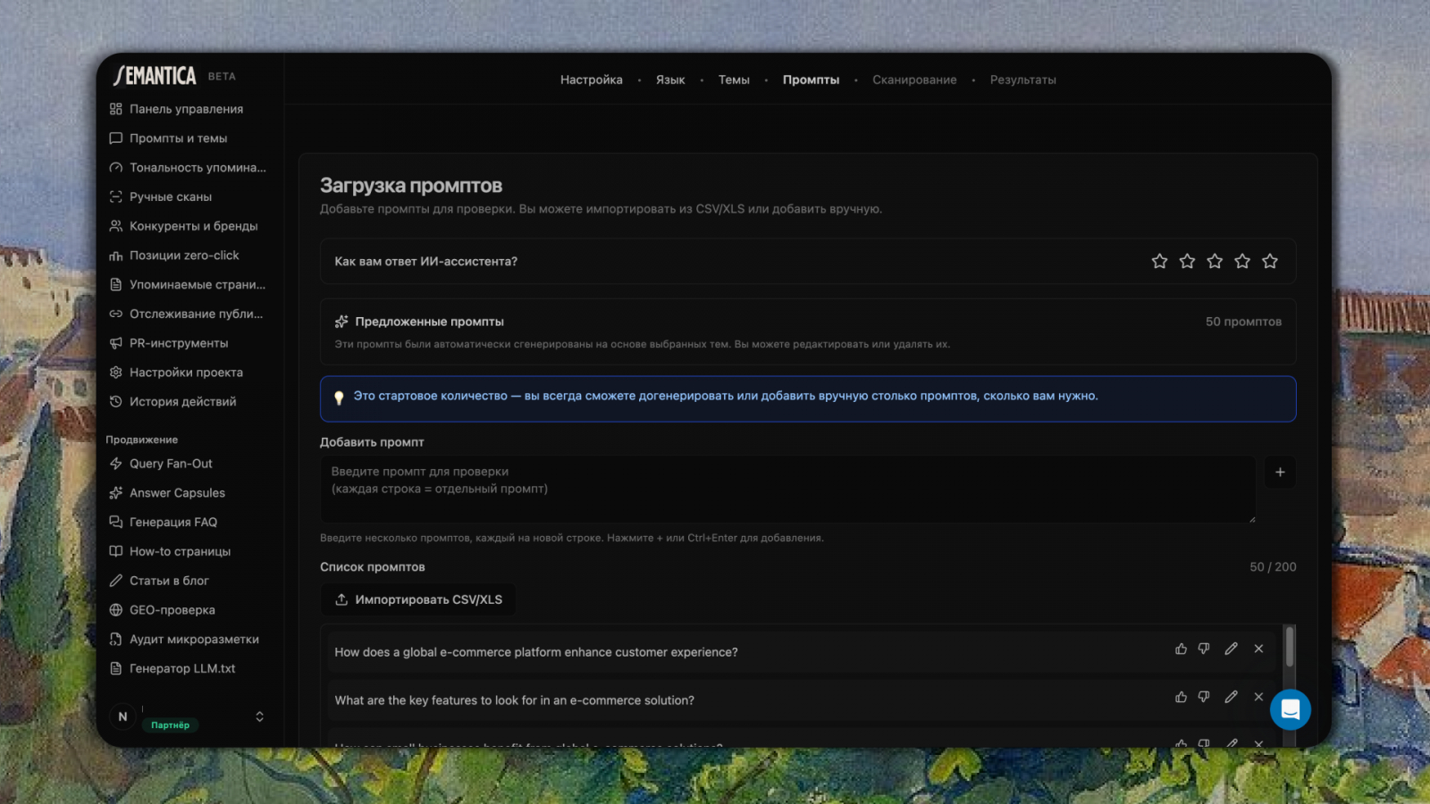 Уникальная особенность: платформа предлагает структурированный подход к работе с промптами через систему тем, импорт данных из CSV/XLS и встроенный AI-генератор для подбора идей запросов. Это делает инструмент особенно удобным для SEO и контент-специалистов, которые только начинают работу с GEO-оптимизацией.