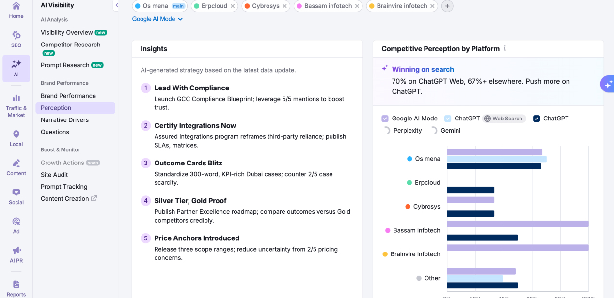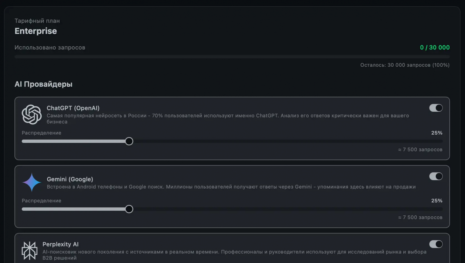 Платформы мониторинга: Полный охват всех популярных AI систем: ChatGPT, Claude, Gemini, Perplexity, YandexGPT