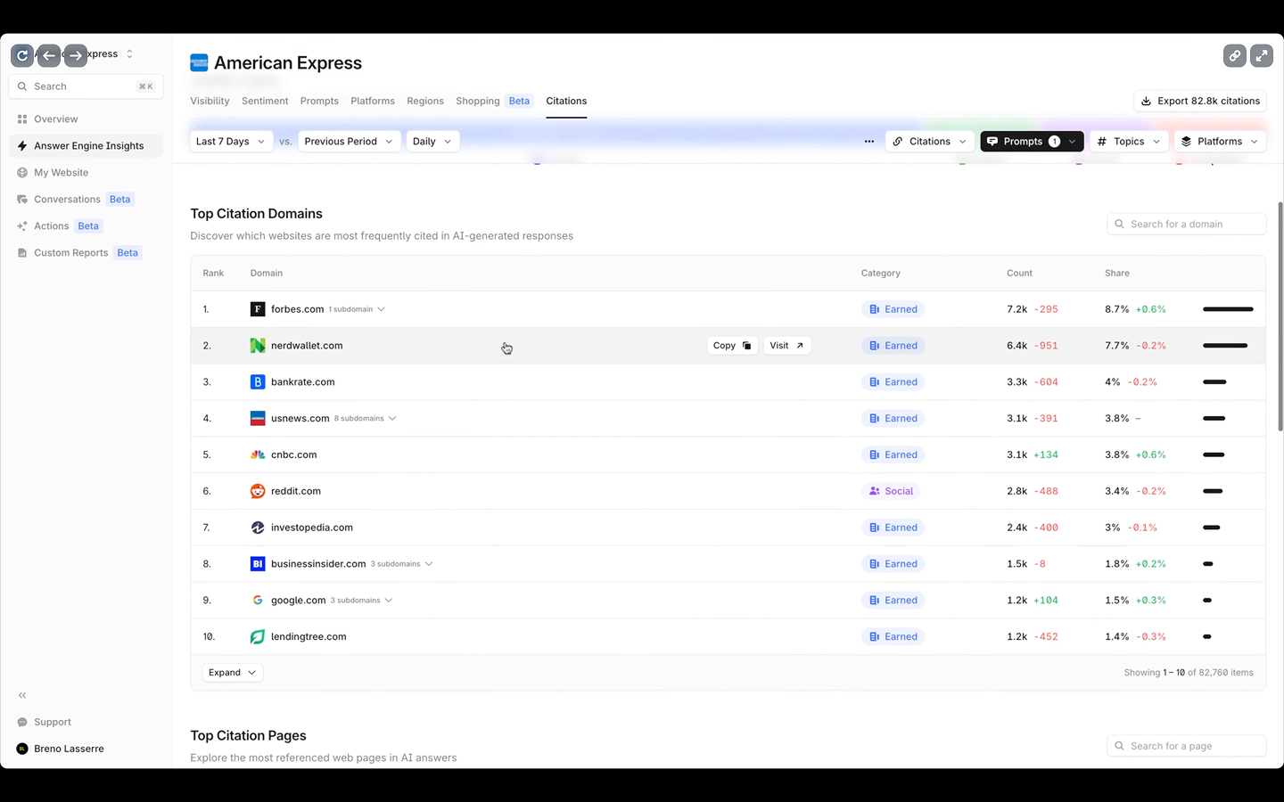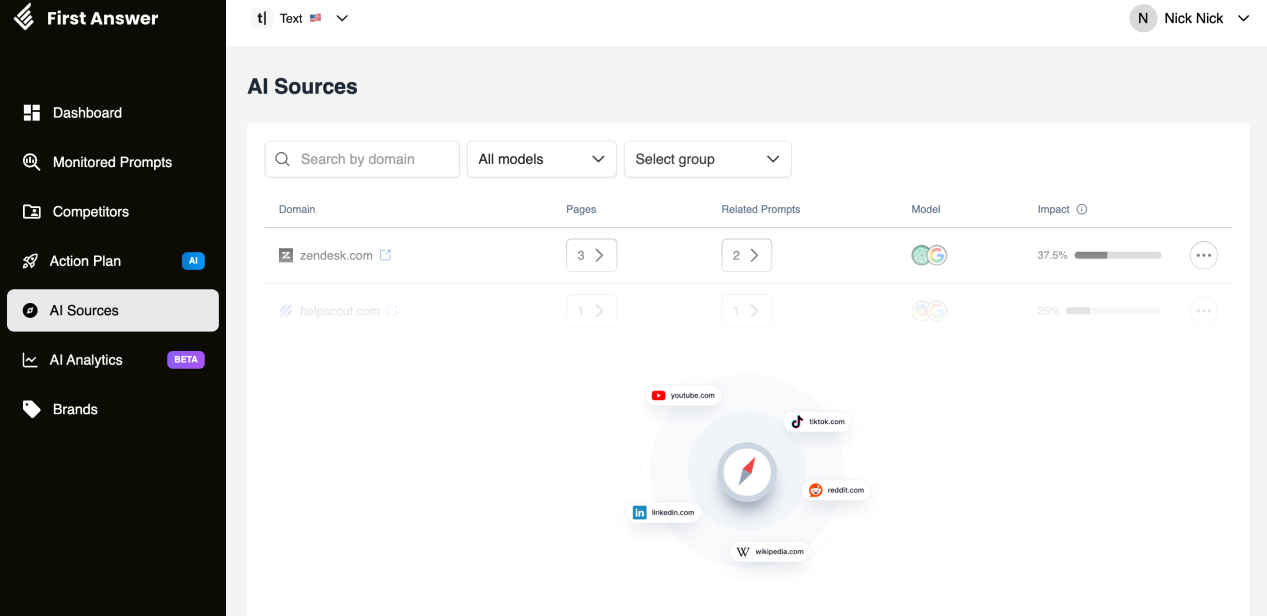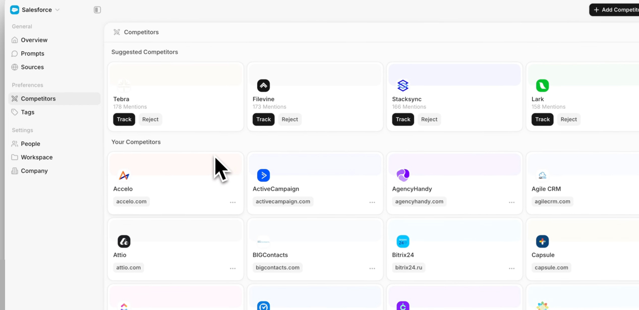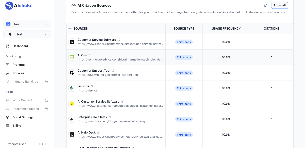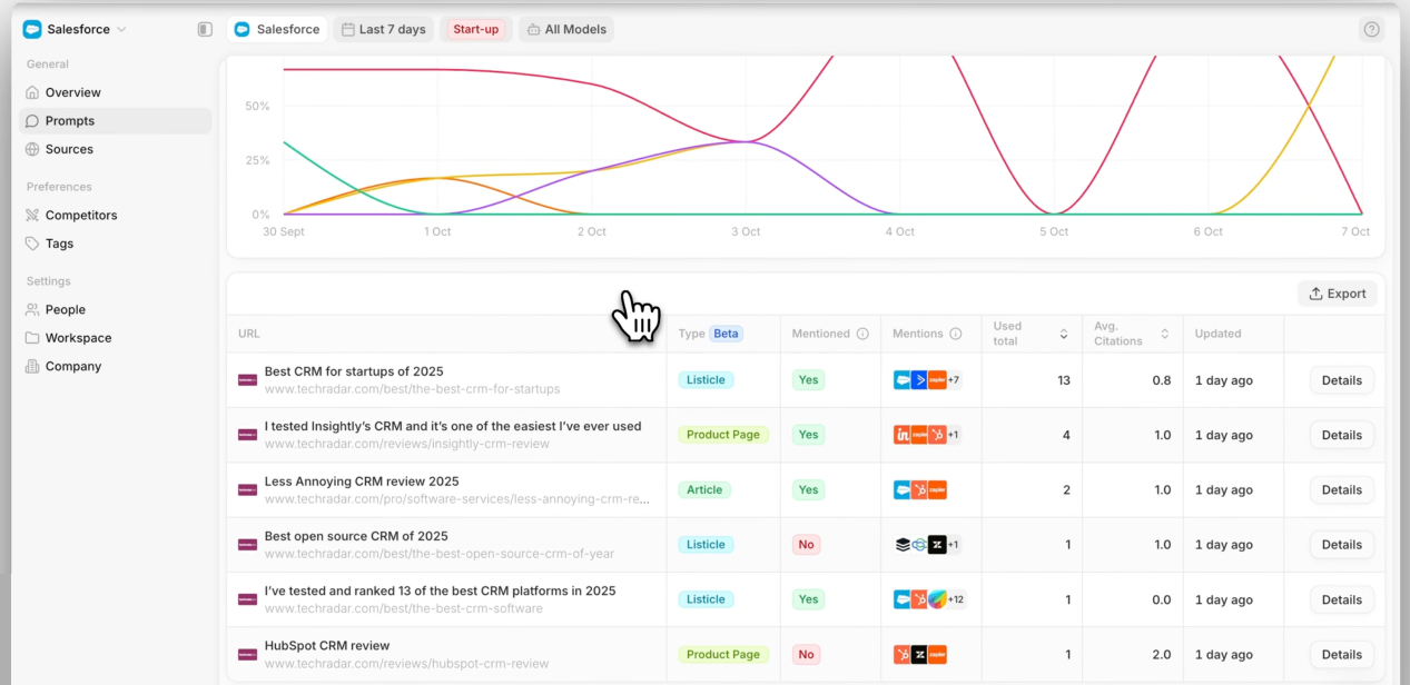 Сервис собирает сайты, которые чаще всего цитируют нейросети. Эти сайты можно отметить как конкурентов для дальнейшего отслеживания.