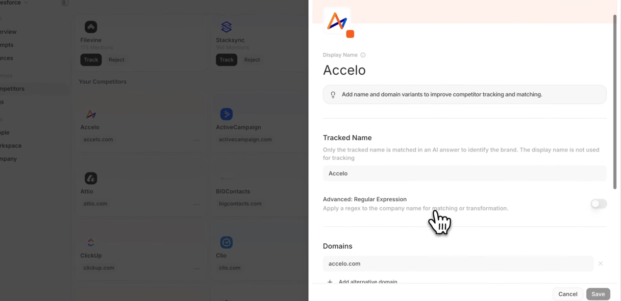 Возможность добавить поддомены (например, blog.company.ru) и альтернативные названия бренда (варианты написания, аббревиатуры) для более точного отслеживания.