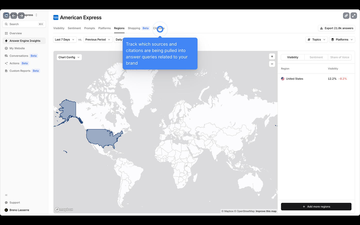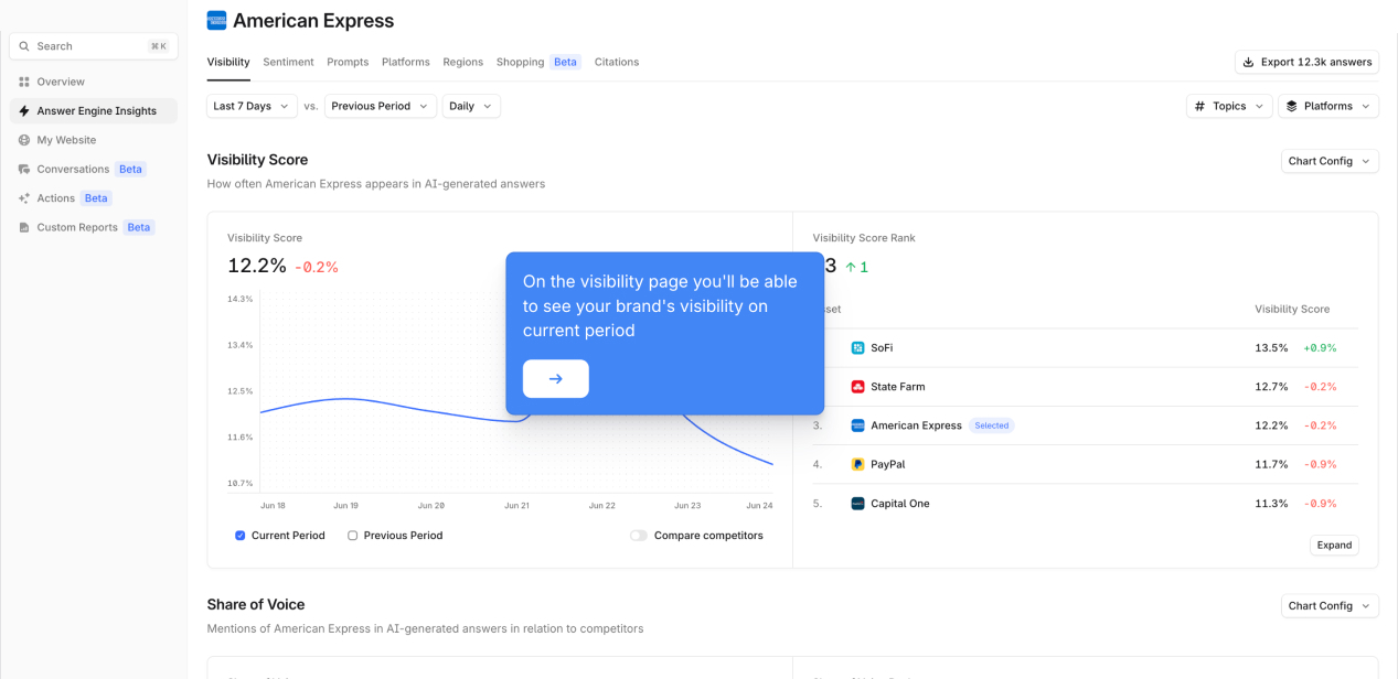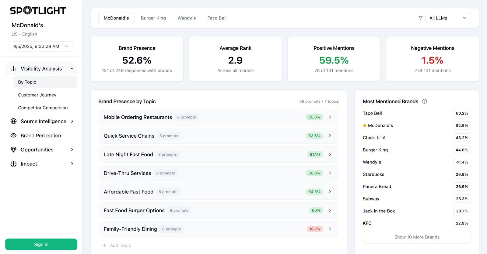 Spotlight — это первый инструмент Share of Voice, созданный для LLM (больших языковых моделей). Платформа отслеживает и улучшает видимость вашего бренда в AI-разговорах.
