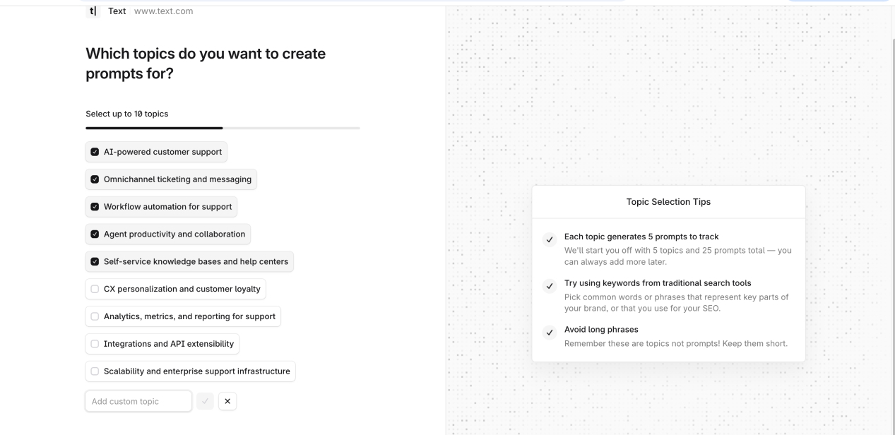 Почему стоит попробовать: Единственный российский инструмент с группировкой промптов по темам, AI-генератором запросов и профилем компании для персонализированных рекомендаций.