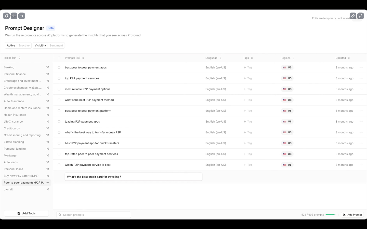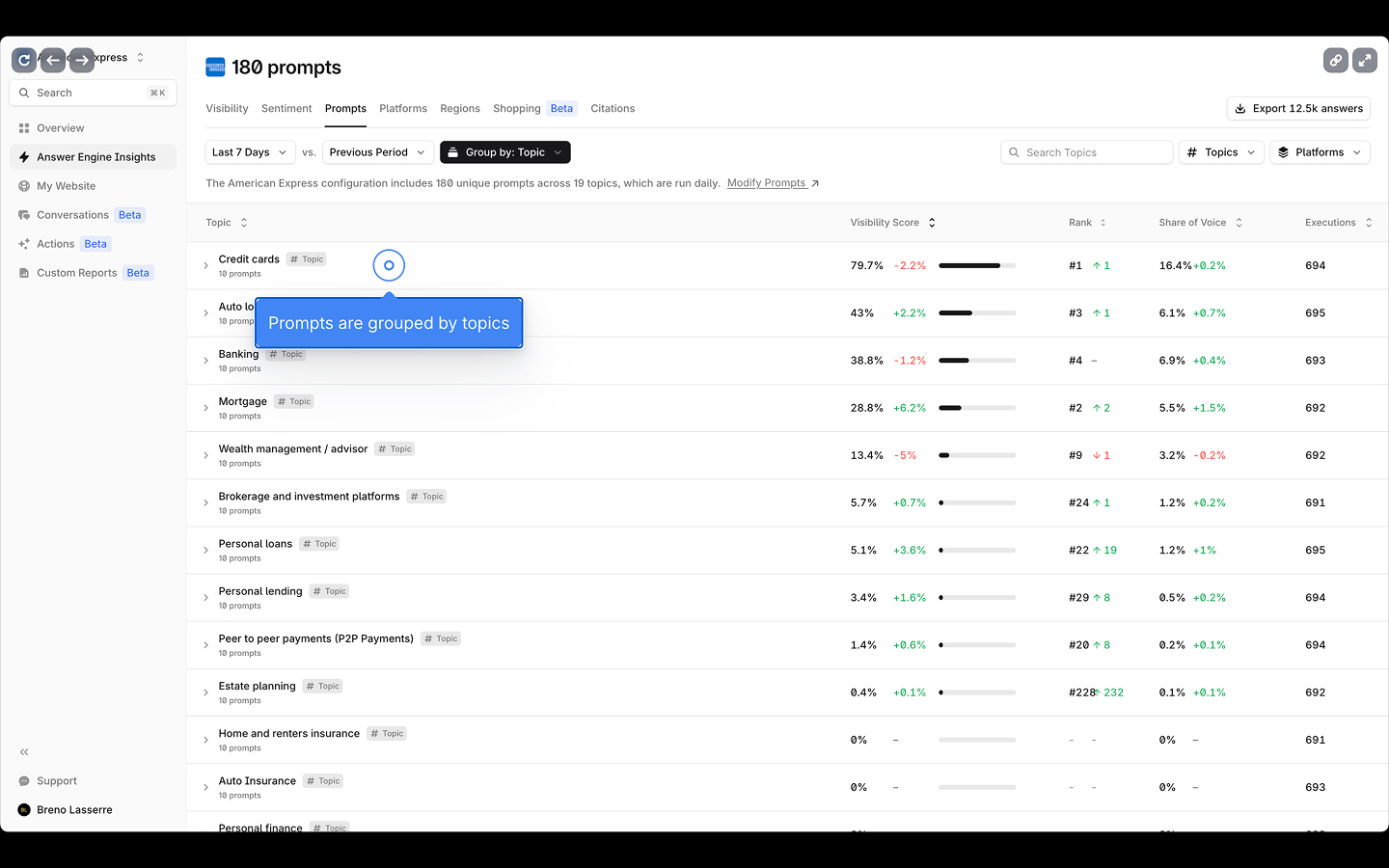 Промпты группируются по темам для удобной организации. Для каждой темы отображается количество промптов, а для каждого запроса — число упоминаний.
