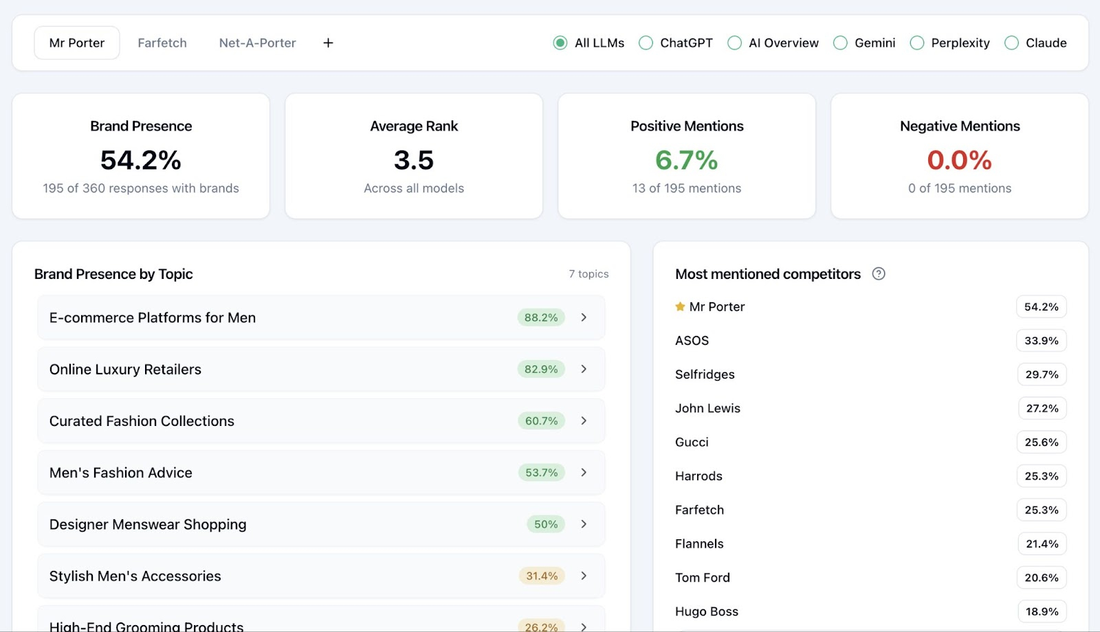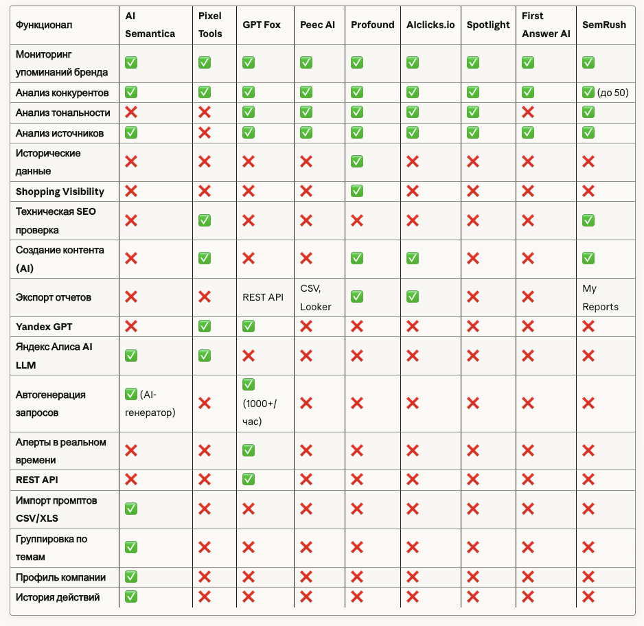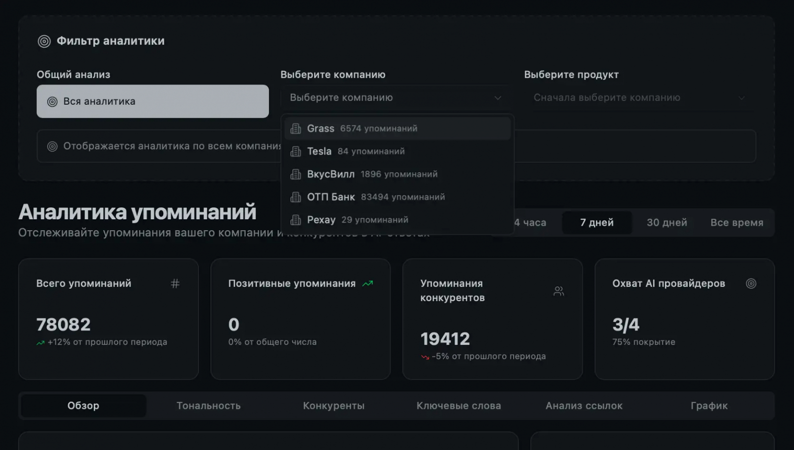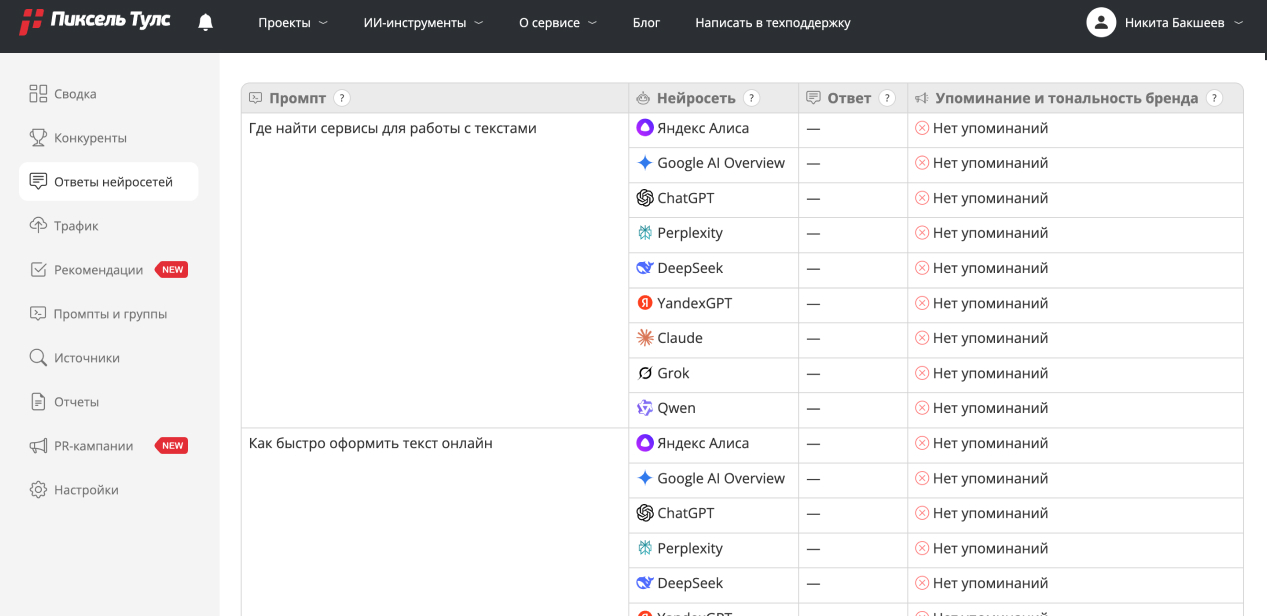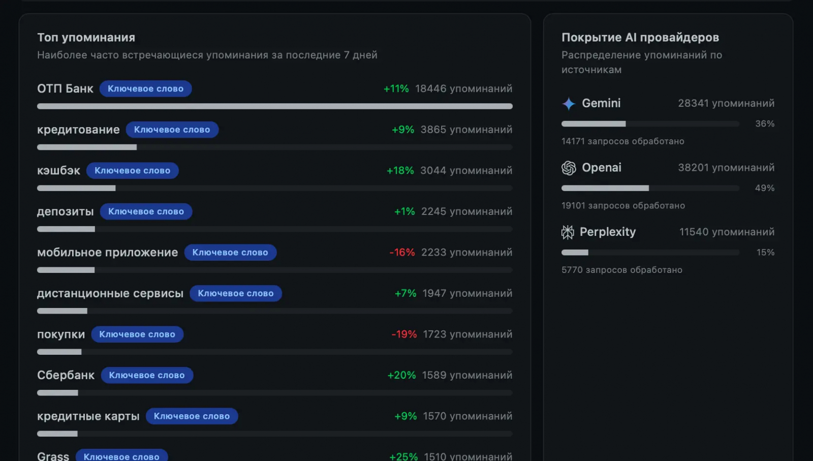 Без аналитики вы летите вслепую. Интуитивные предположения о том, насколько хорошо ваш бренд представлен в AI, могут оказаться далеки от реальности. Инструменты мониторинга — это не роскошь, а необходимость для принятия обоснованных решений. Они показывают не только где вы есть, но и где вас нет, а там вполне могут быть ваши конкуренты.