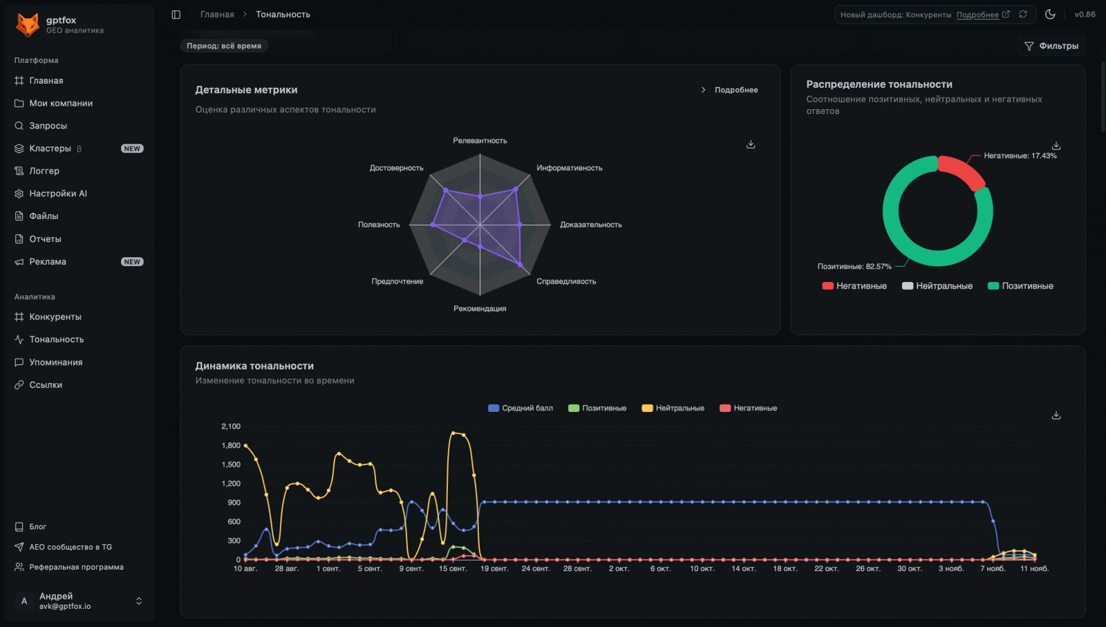 GPTFox — российский сервис для мониторинга присутствия брендов в AI-ответах с автоматической генерацией запросов, анализом ответов и уведомлениями.Ключевые возможности: