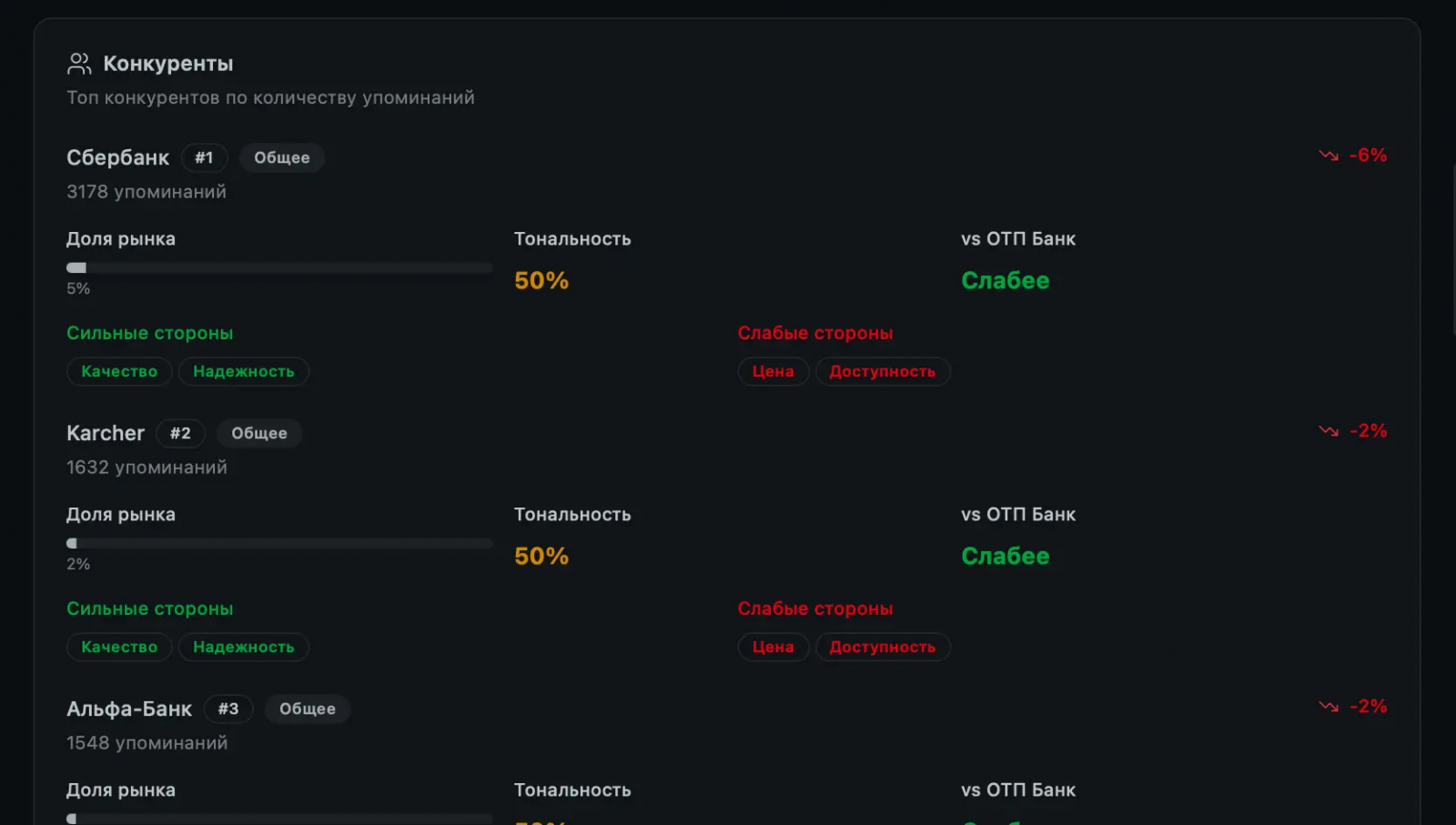 - Сравнение с конкурентами в реальном времени, отслеживание доли упоминаний и позиций