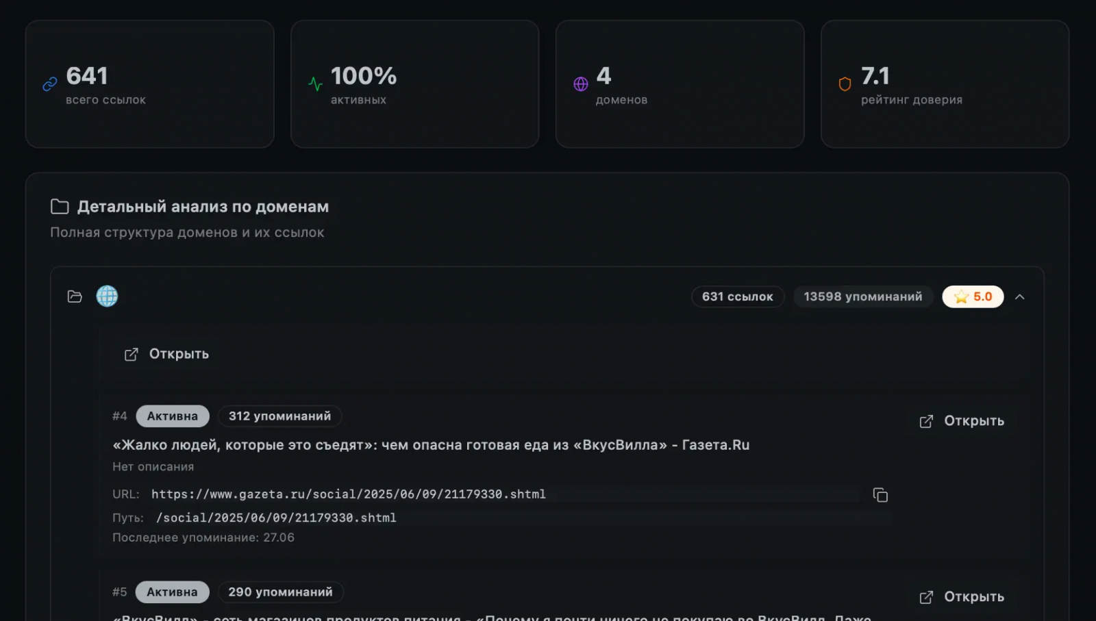 - Детальный анализ каждого упоминания: тональность, контекст, источники трафика