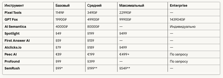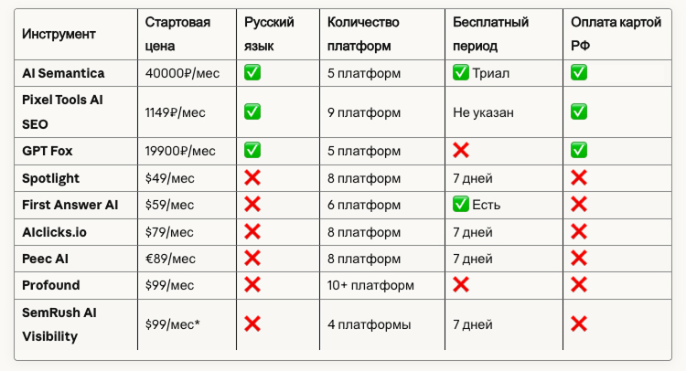 Мы собрали для вас 11 инструментов, которые помогают анализировать присутствие вашего бренда или услуги в ответах ИИ моделей и показывать вашу видимость в них.
